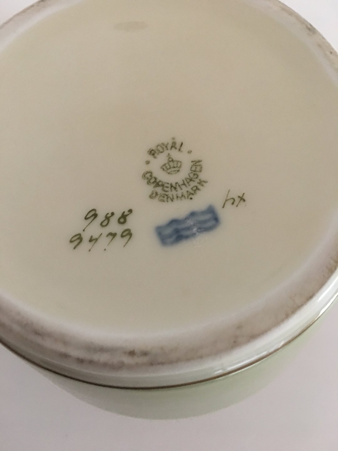 Royal Copenhagen Dagmar Sugar Bowl with Lid No. 9479. Measures 8 cm H. 12 cm dia. In nice condition.