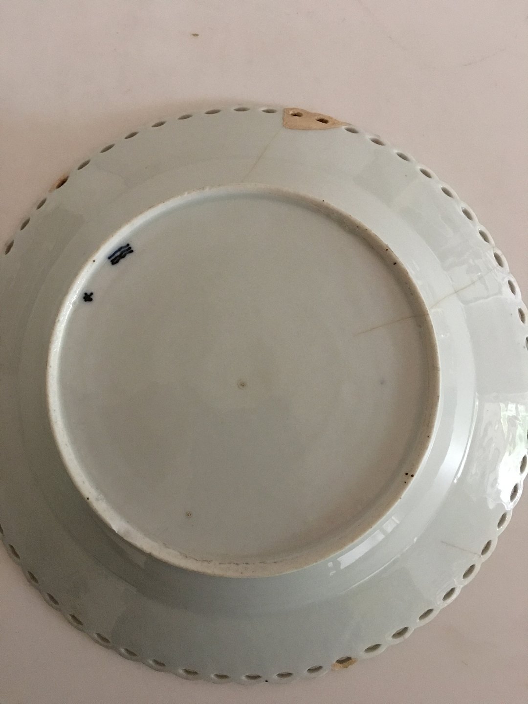 Royal Copenhagen Antique Blue Fluted Full Lace Plate. Measures 23.5 cm dia. / 9 1/4 in. Chipped and glued in two places on the lace rim. Also has a couple of hair cracks.