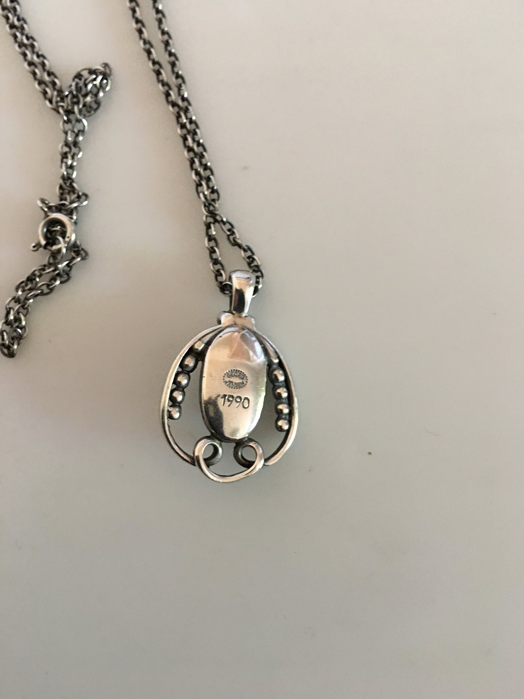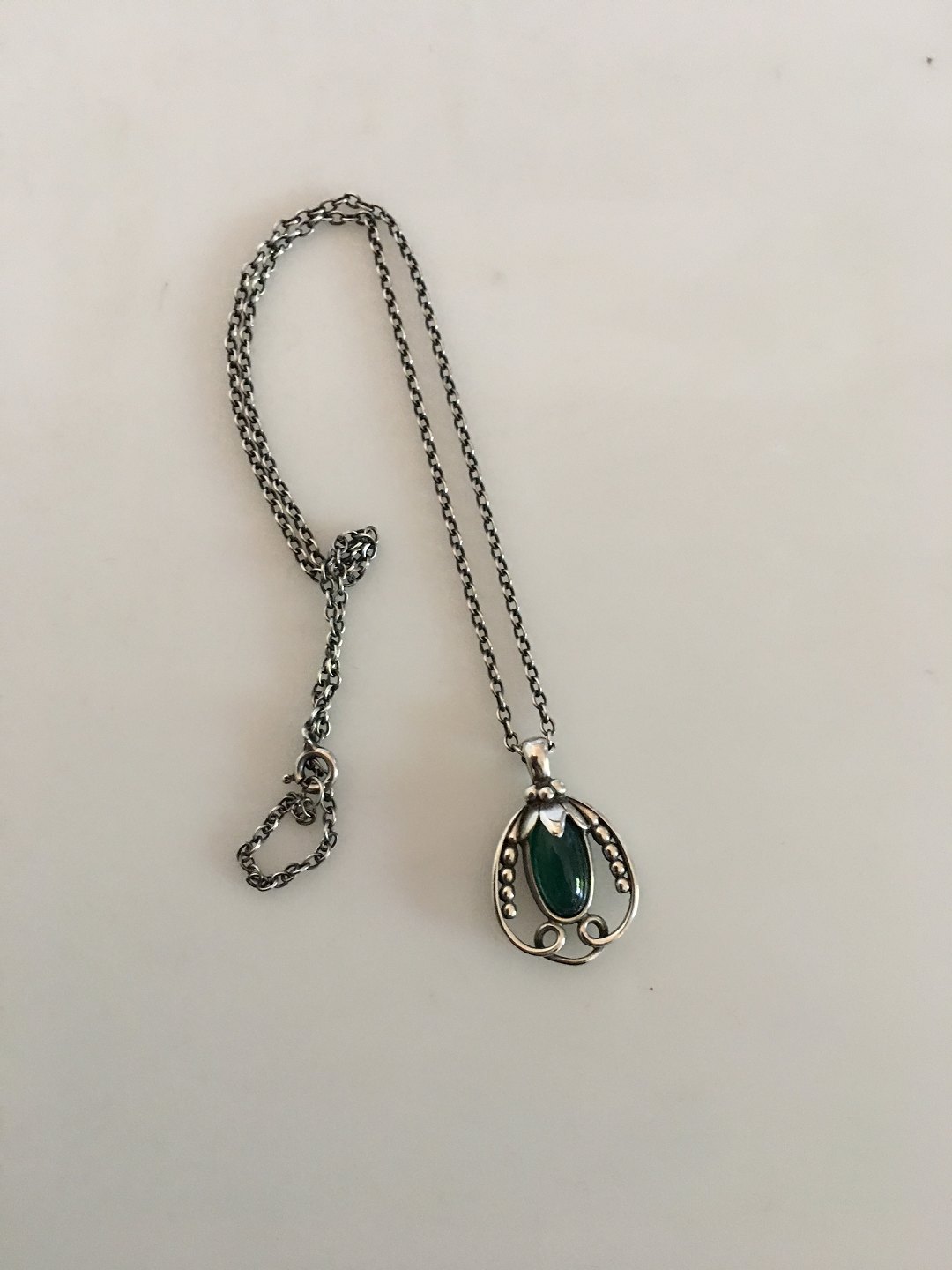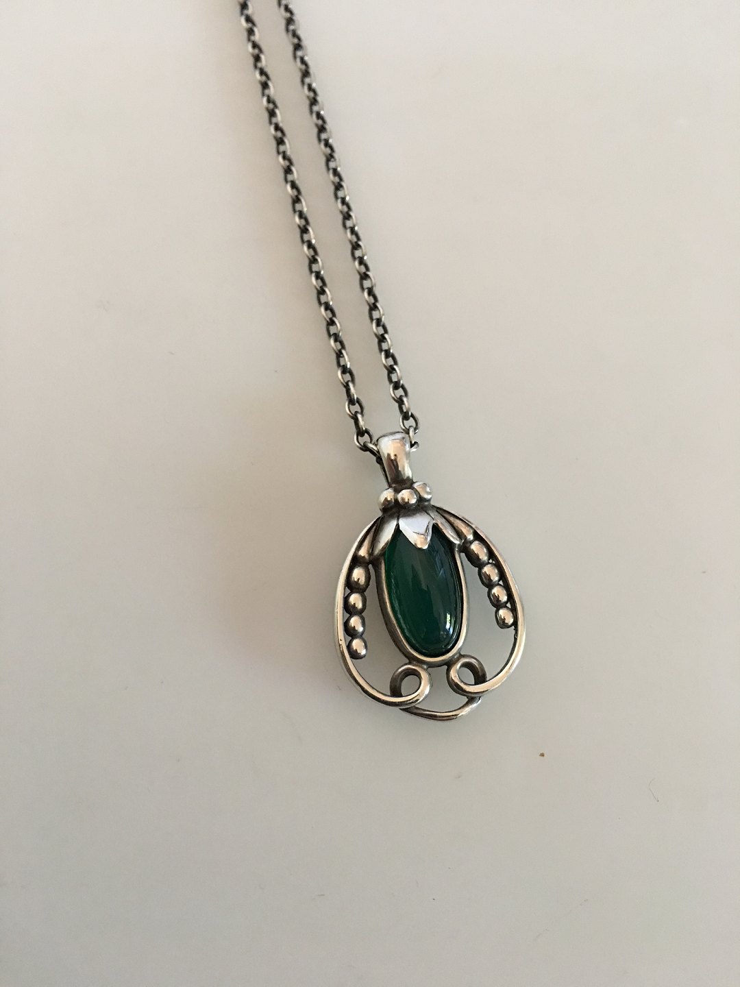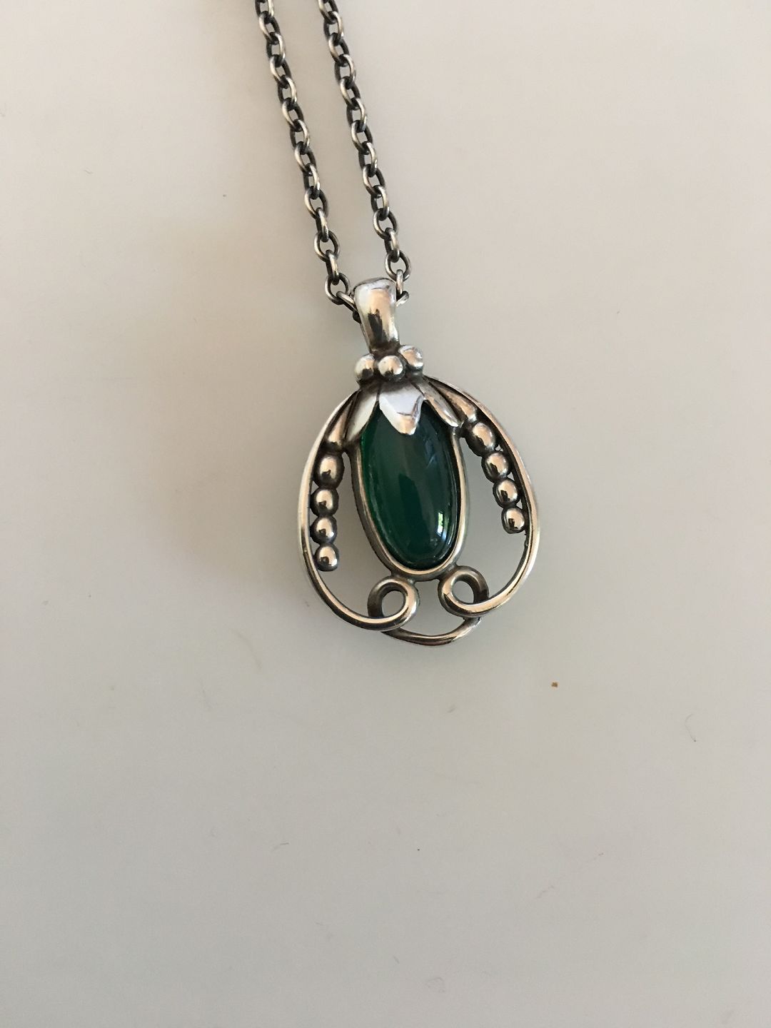 Georg Jensen Sterling Silver 1990 Annual Pendant with Green Agate in Chain. Chain measures 45.5 cm / 17 29/32 in. Pendant measures 3 cm / 1 3/16 in. Weighs 9.6 g / 0.34 oz.