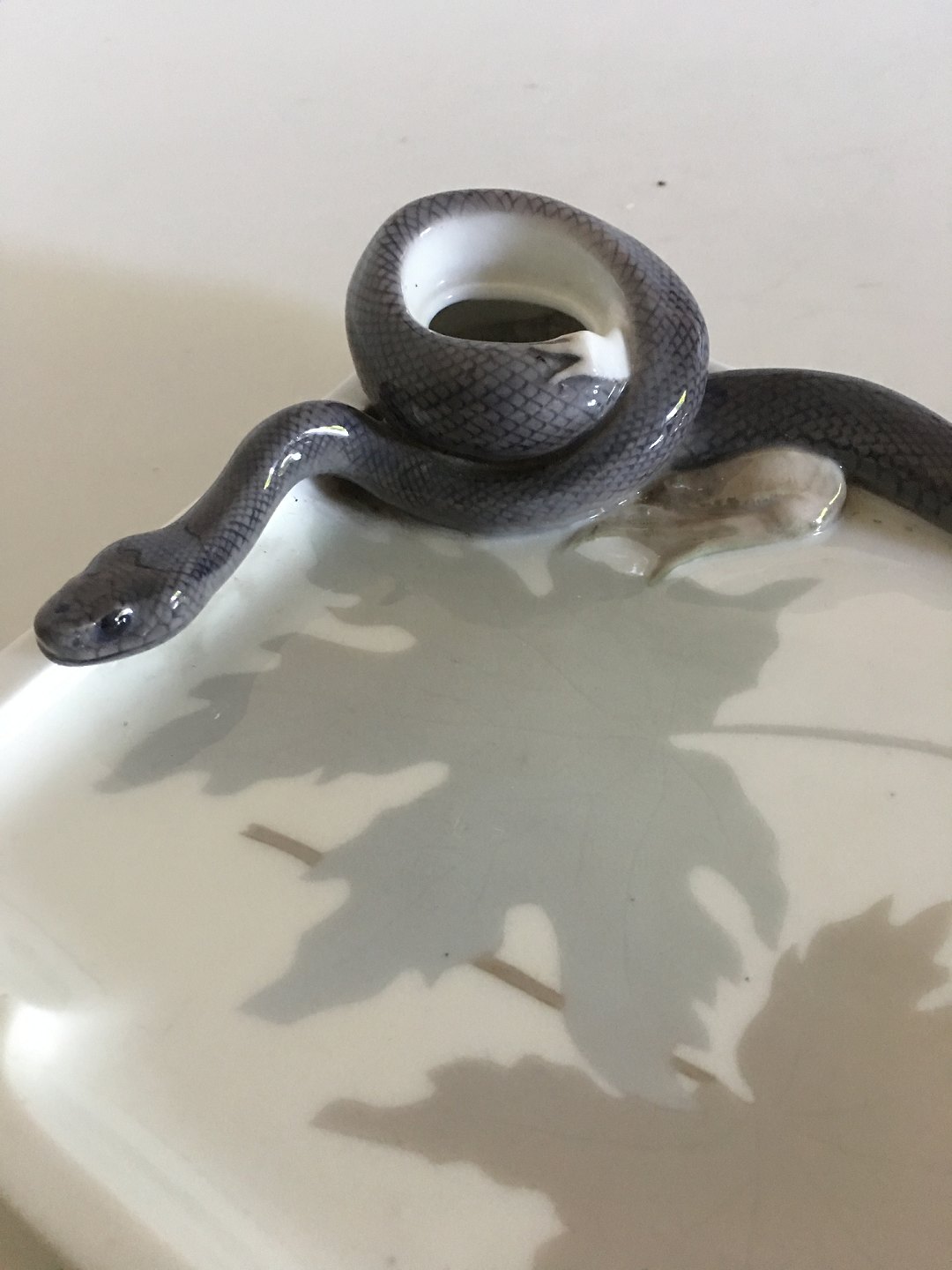 Royal Copenhagen Inkwell Tray No. 19 with Snake and Frog. The lid the inkwell is missing, and the tray has a burning mistake in the one corner (look at picture). With old Royal Copenhagen marks. Measures 27.5 x 18 cm