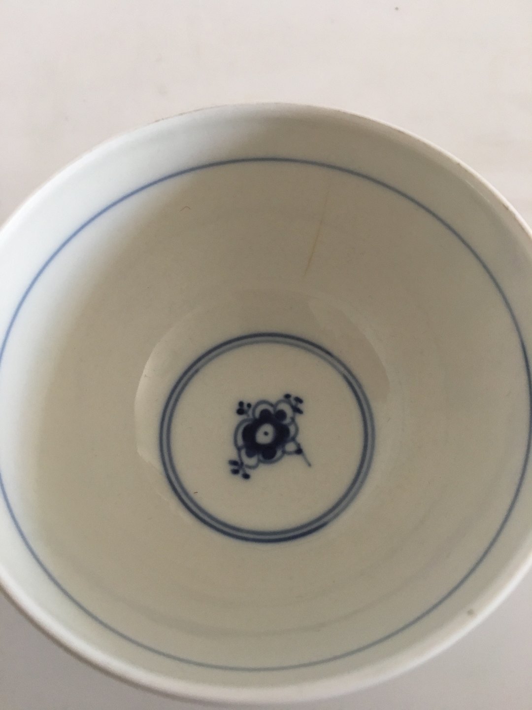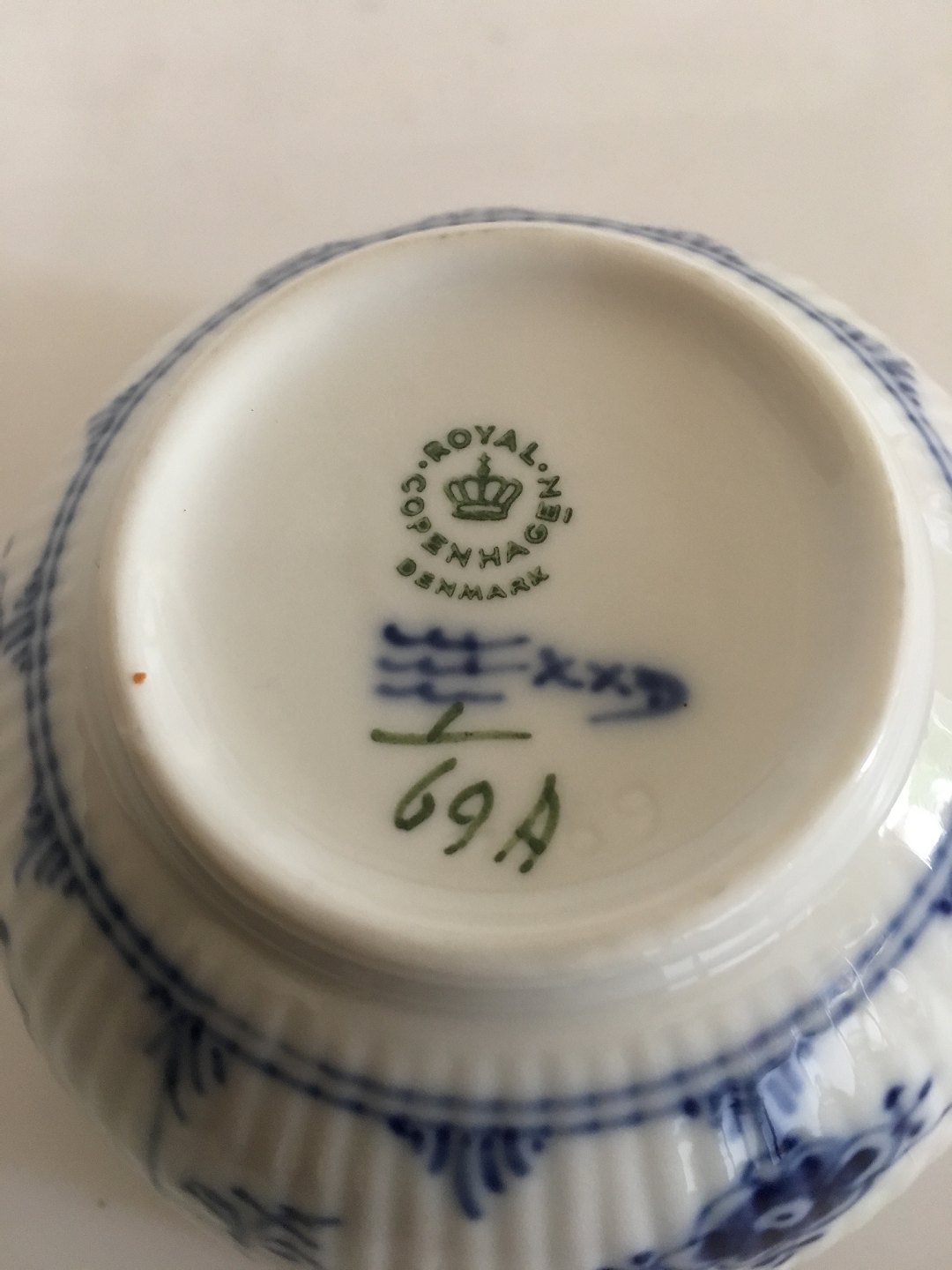 Royal Copenhagen Musselmalet Riflet Tekop uden Hank No. 69A. 6 cm Høj. 10.5 cm diameter. 1. Sortering. Har en lille hårrevne ellers i pæn stand. Kan også anvendes som en lille bonbon skål.