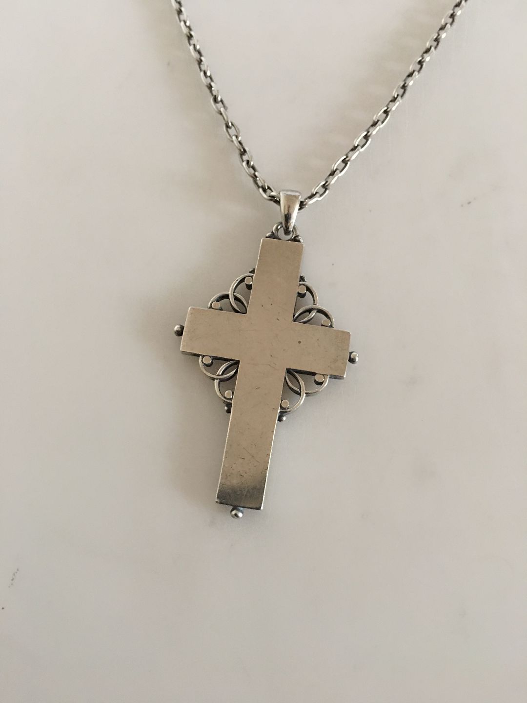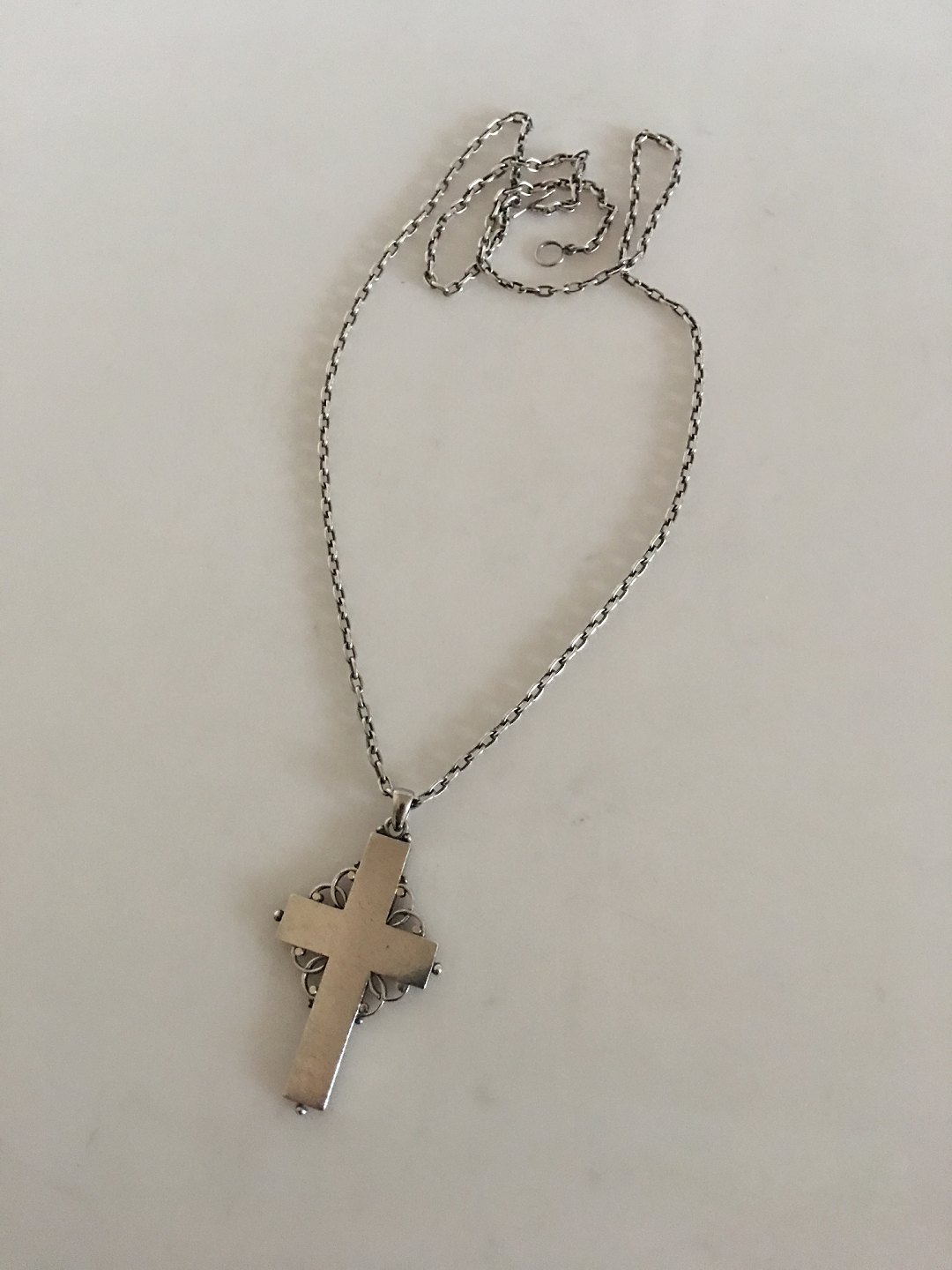 Georg Jensen & Wendel Sterling Sølv Halskæde med Korsvedhæng No 89B. Vedhæng måler 5.2 x 3 cm. Kæden er 60 cm. Vejer 21 gram. Produceret 1945-1951.