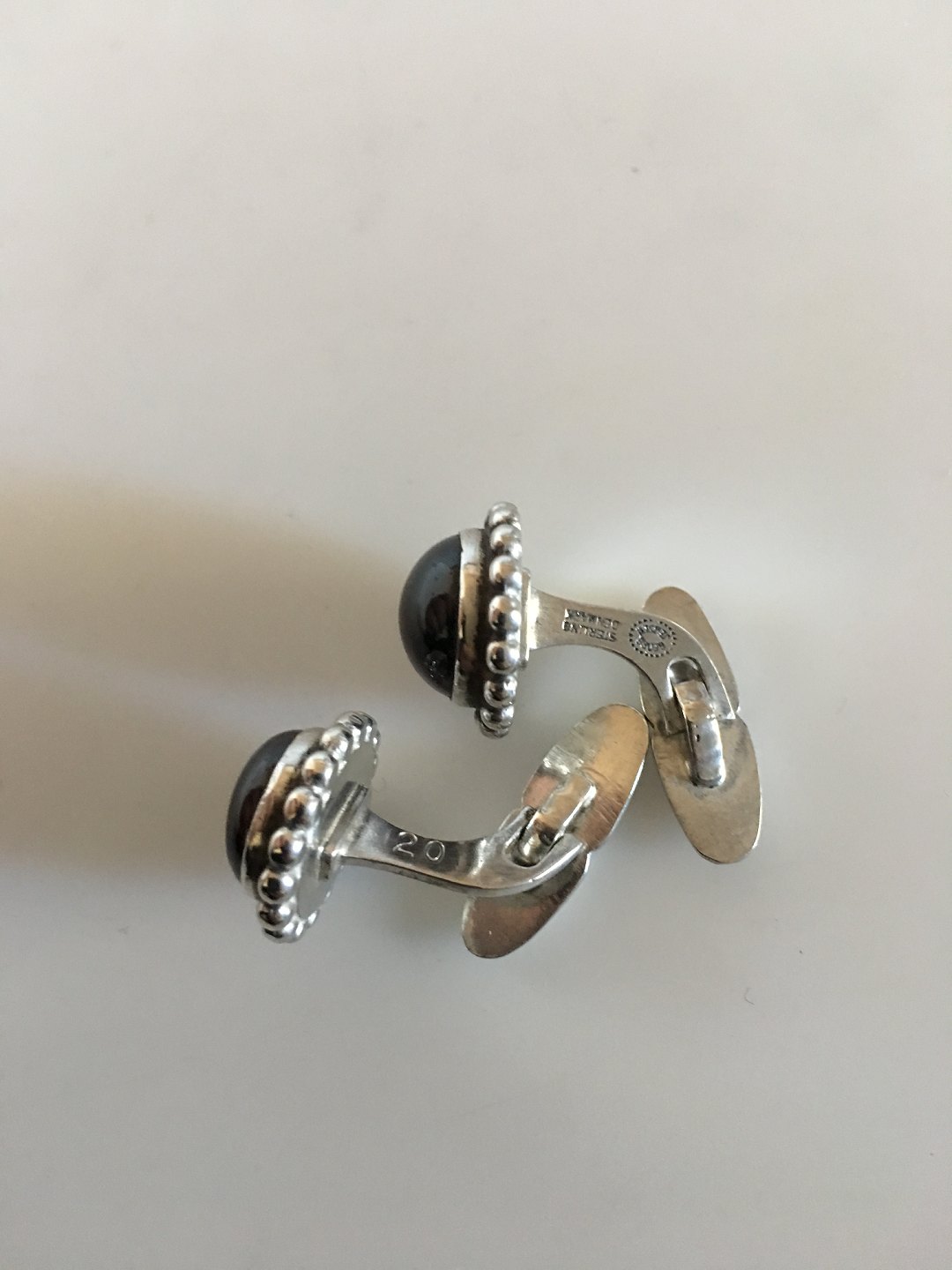 Georg Jensen Sterling Silver Cufflinks No. 20 With Red Carnelians. Measures 1.5 cm diameter. Combined weight of 14 grams. From after 1945.