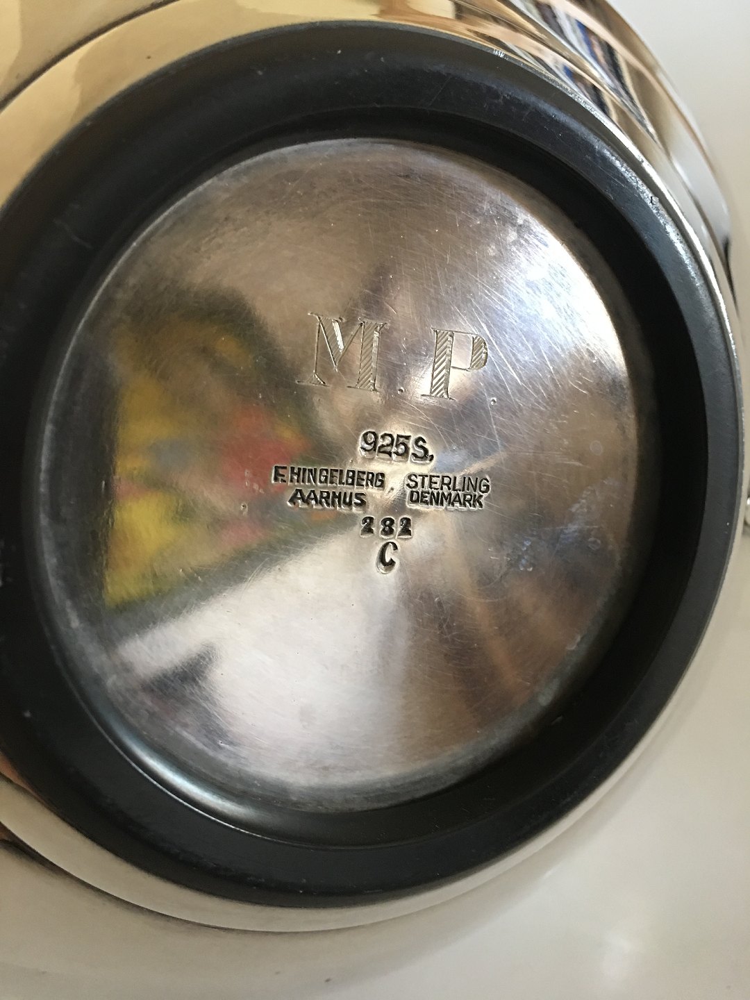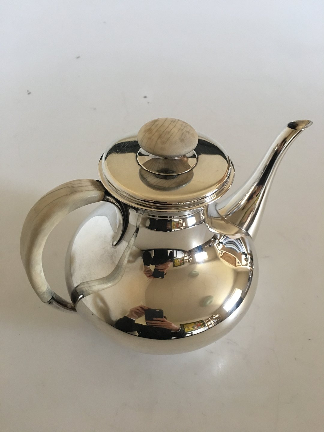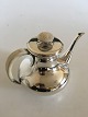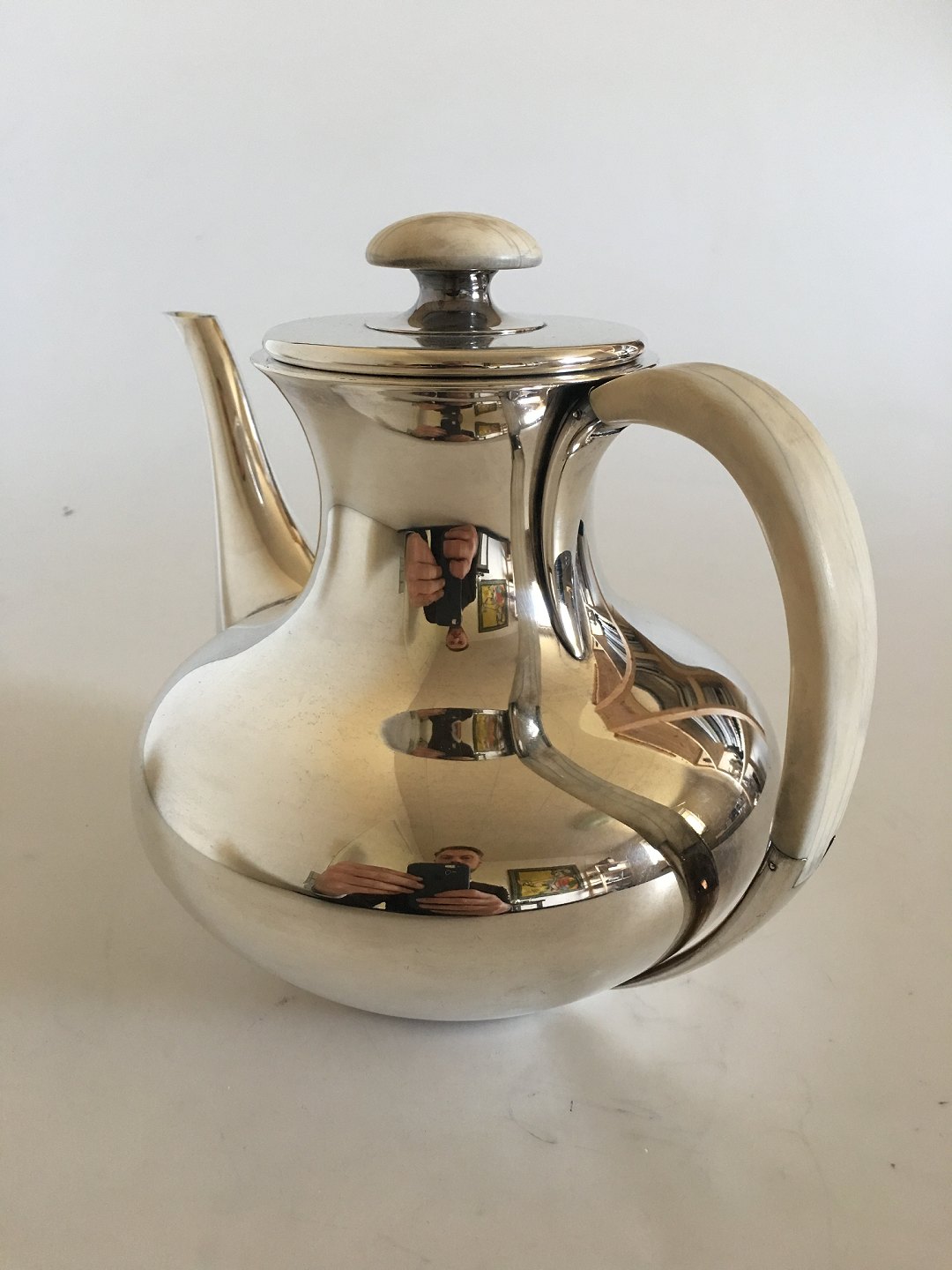 F. Hingelberg Sterling Silver Coffee Pot No. 232 C with Ivory Handle. Measures 18 cm H (7 3/32"). Weighs 876 grams. In good condition. The Ivory does have some wear to it.