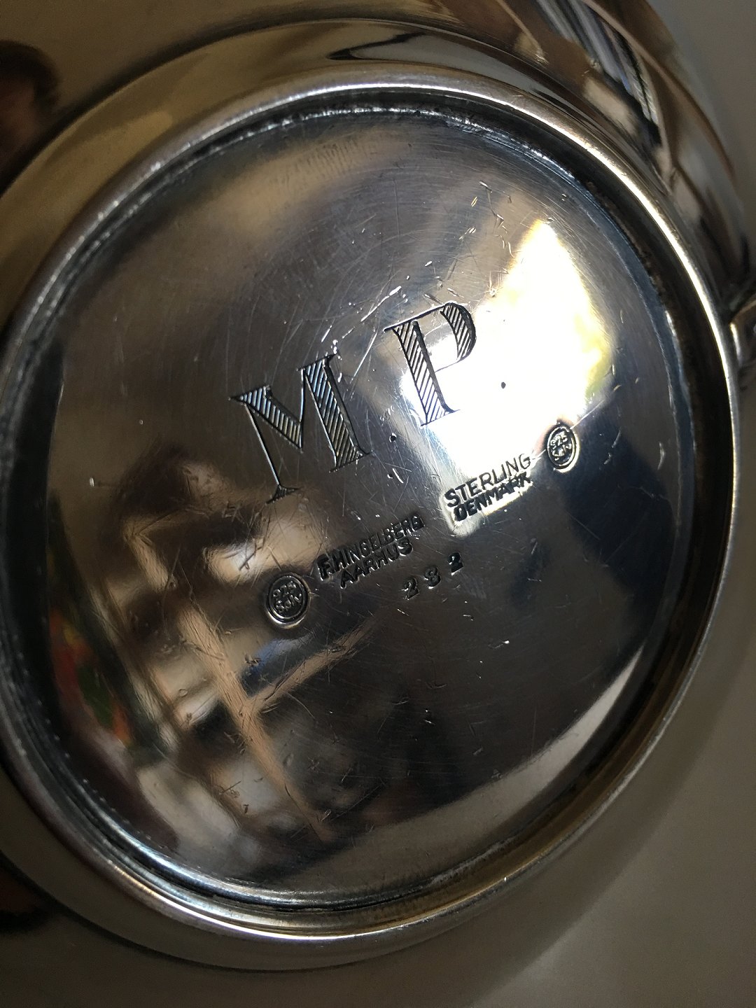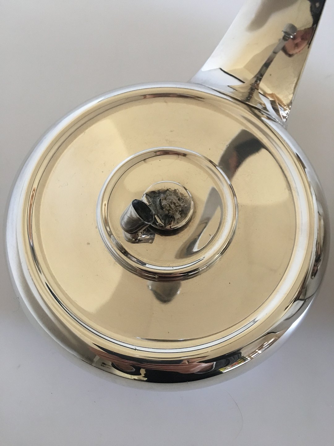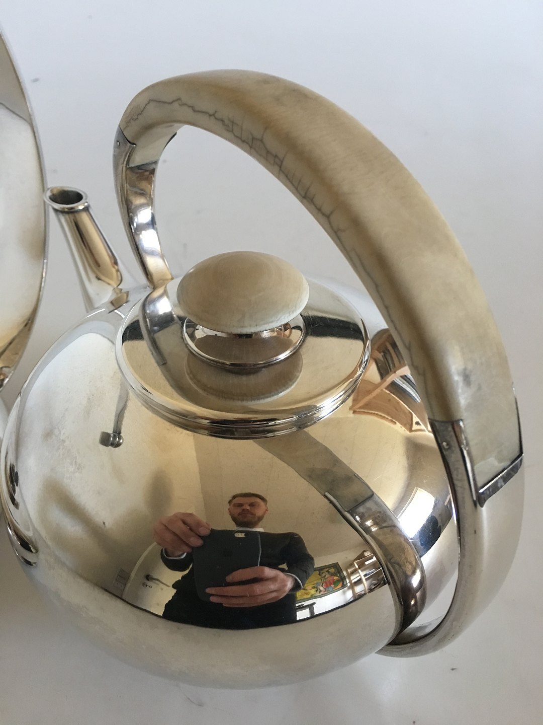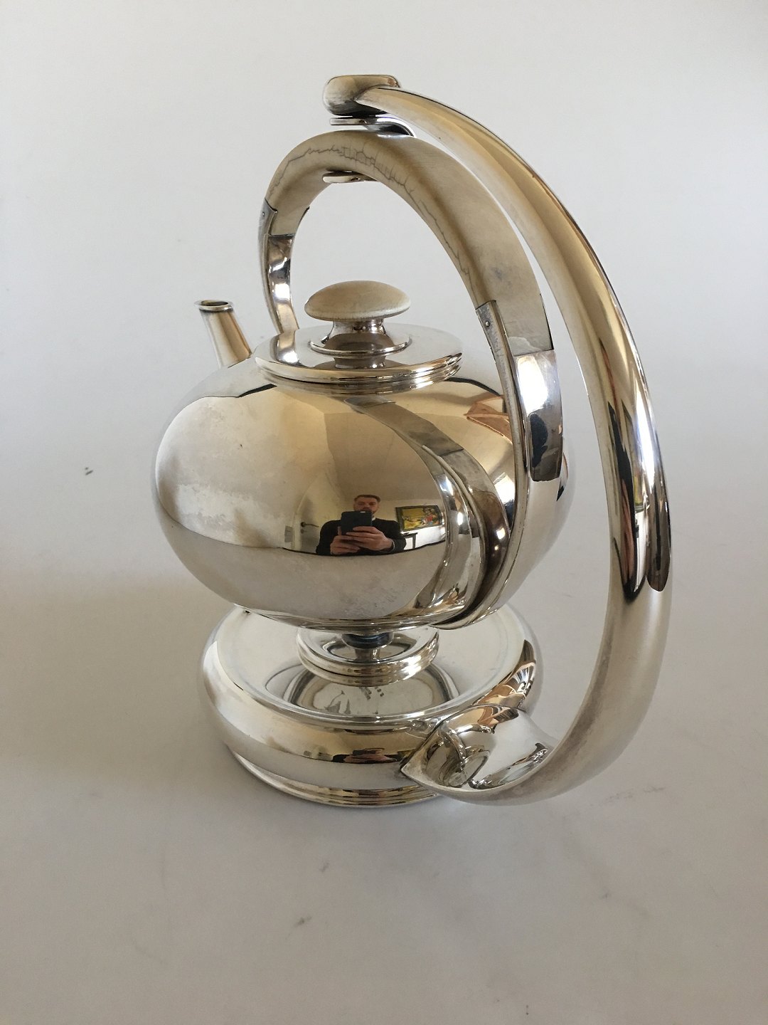 F. Hingelberg Sterling Silver Teapot with Ivory Handle and Matching Heating Stand. The Tea Pot measures to the top of the handle 18 cm H (7 3/32"). The heating stand measures 25.5 cm H (10 3/64"). In good condition, but the ivory does have some wear to it. Combined weight of 2258 grams.