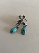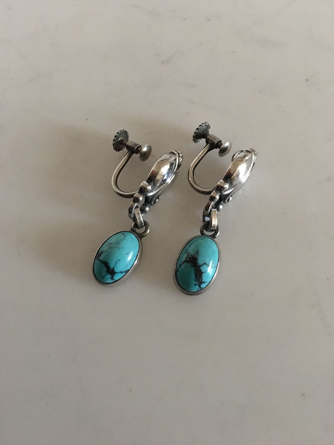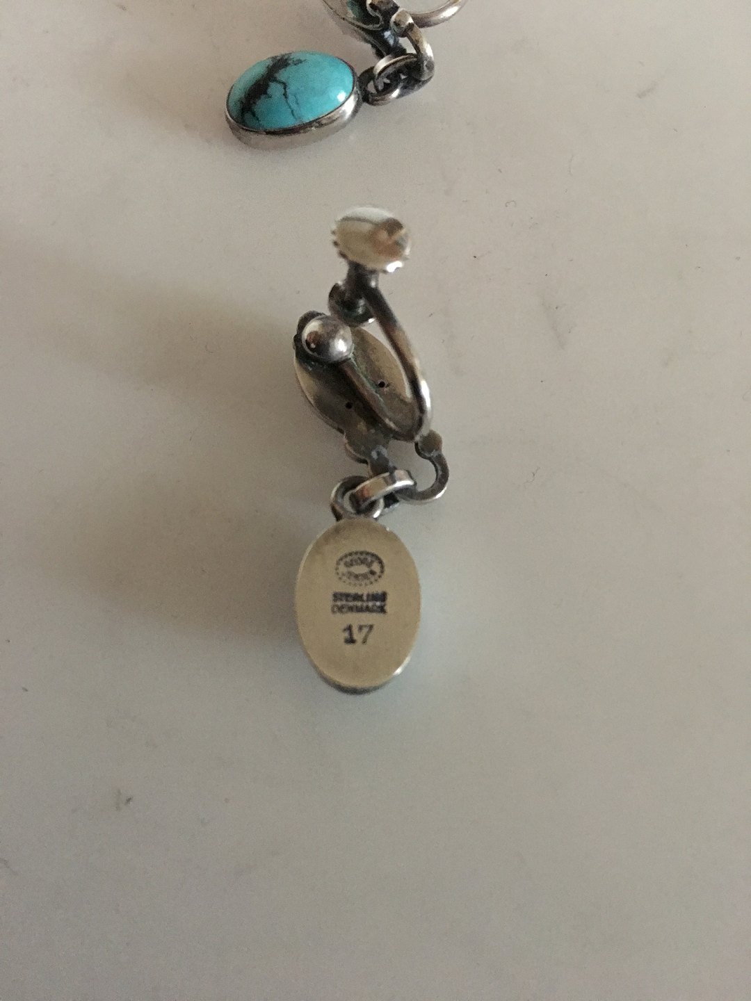 Georg Jensen Sterling Silver Earrings No 17 with Turquoises. Measures 3.5 cm / 1 3/8 in. Combined weight of 5 grams. Manufactured after 1945. Earscrew Lock