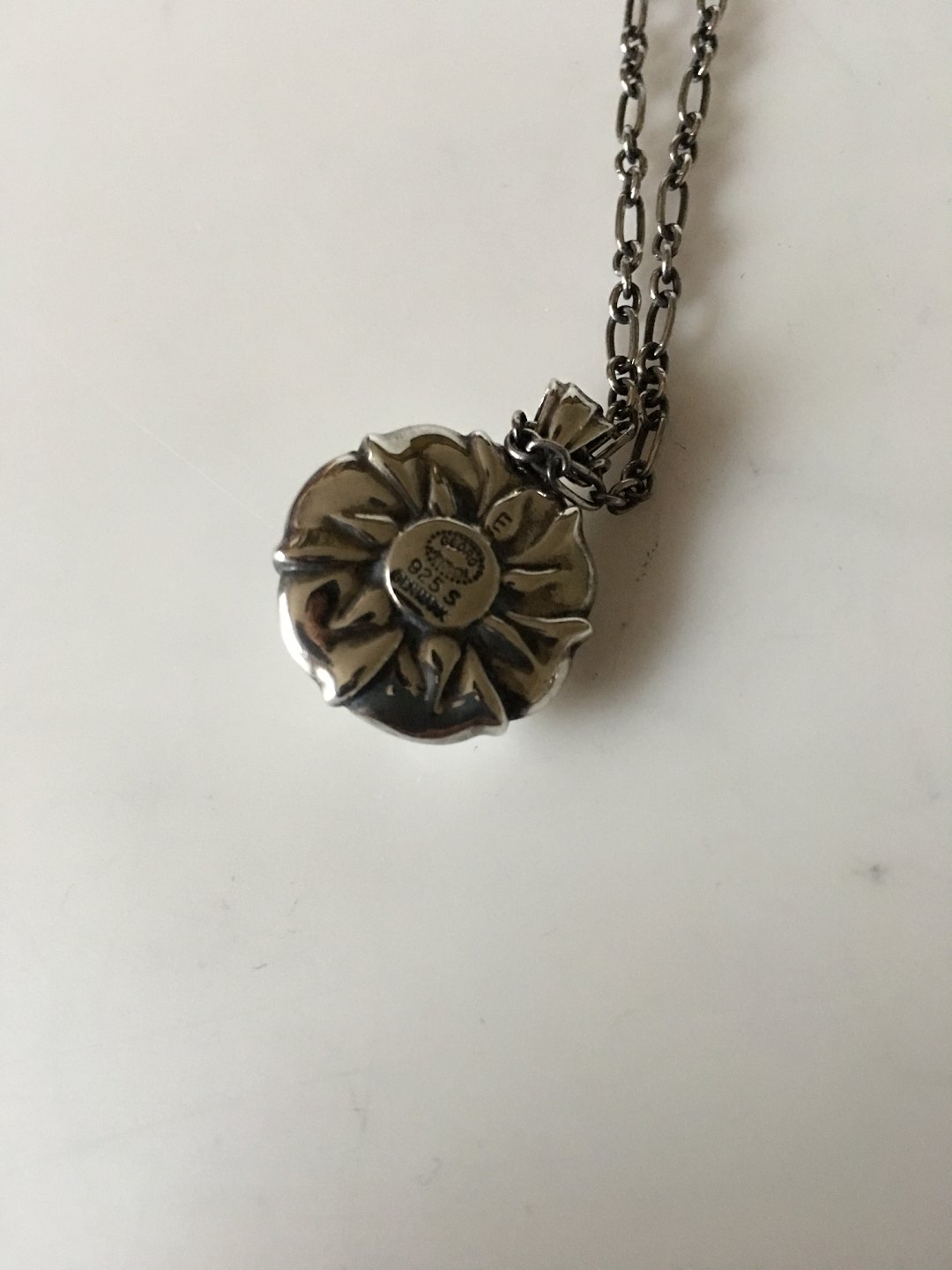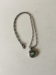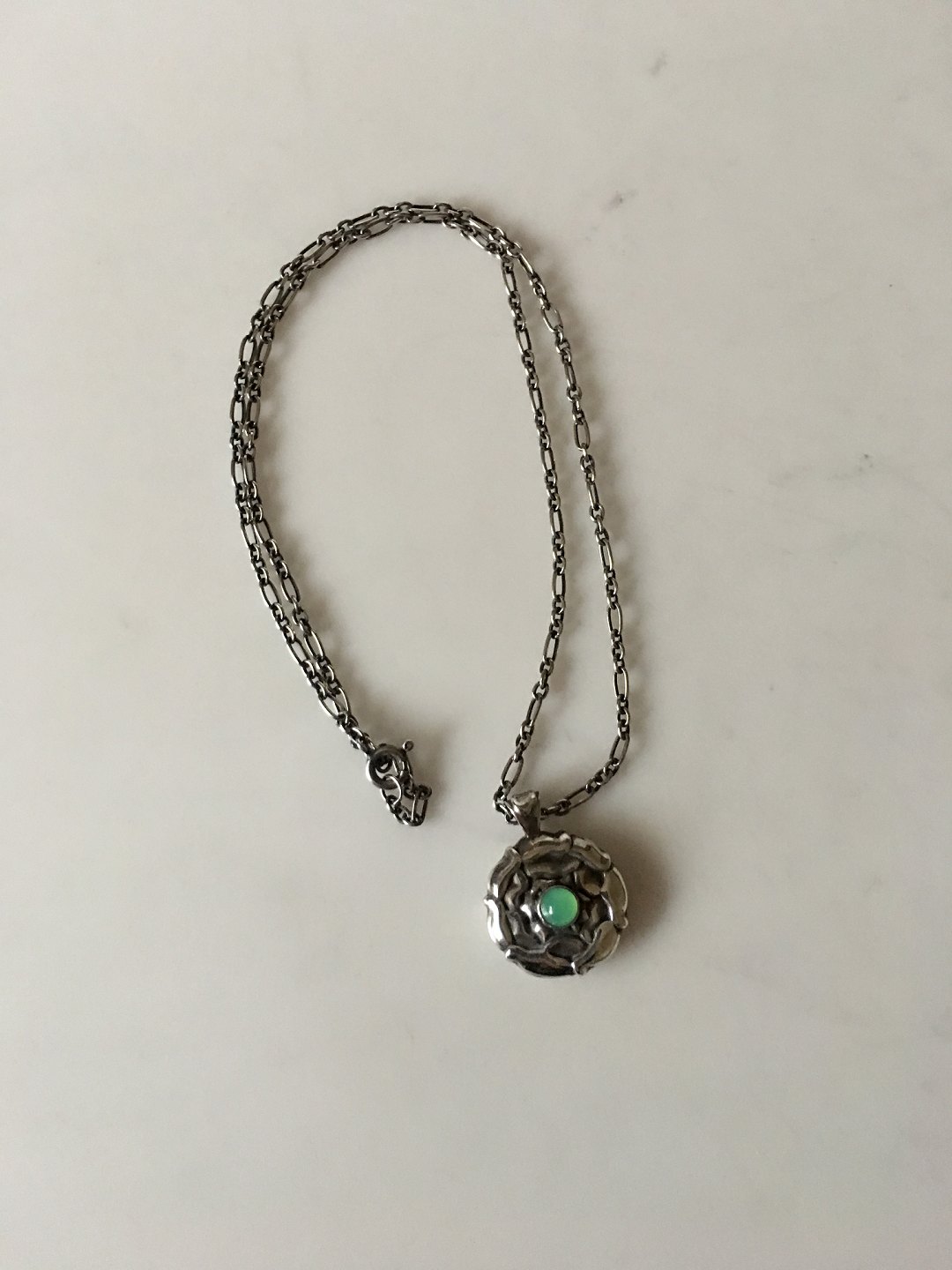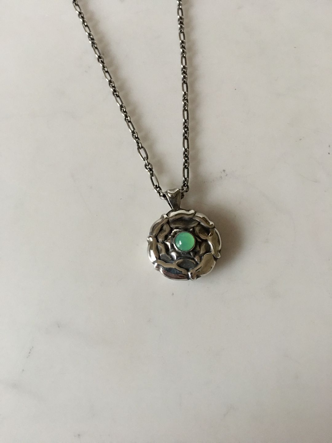 Georg Jensen Sterling Sølv Halskæde med Lys Grøn Sten. Vedhæng måler 2 cm Ø. Kæden måler 44 cm. Vejer 15,5 gram. Produceret efter 1945.