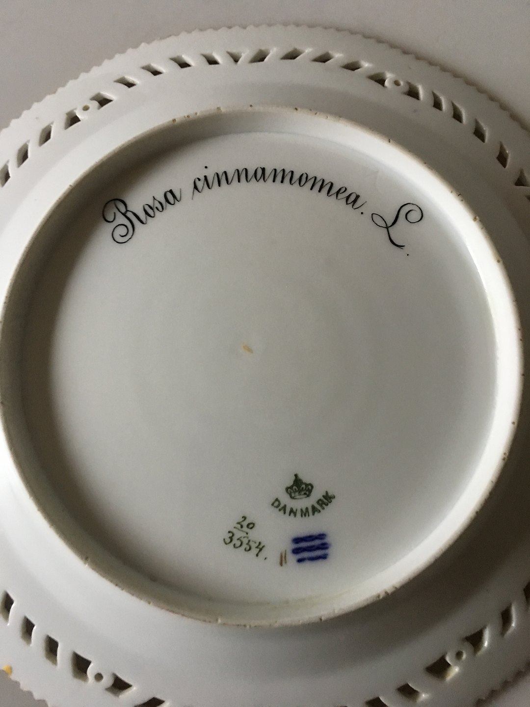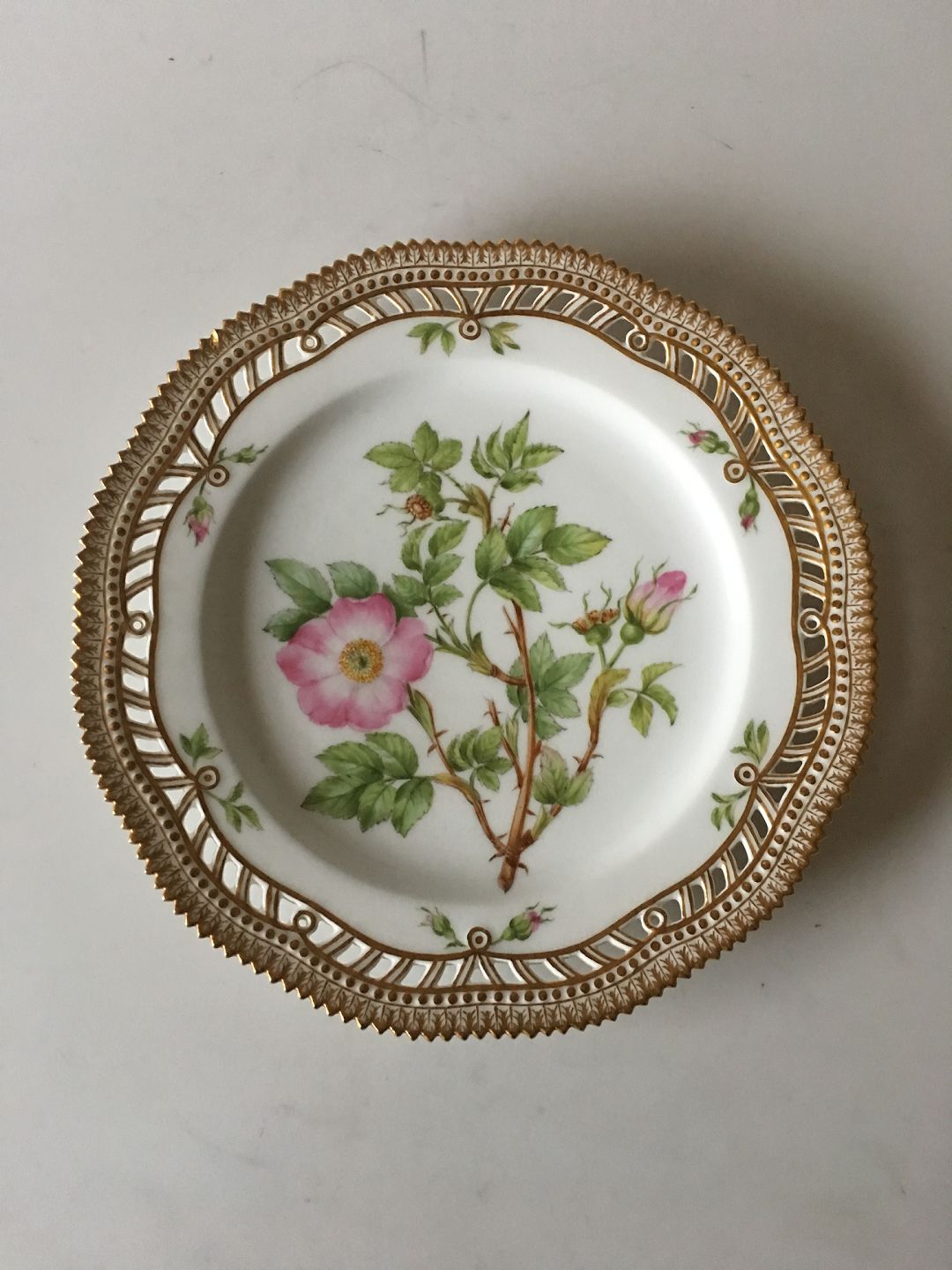 Royal Copenhagen Flora Danica Frokosttallerken med Gennembrudt Kant No. 20/3554. Tallerkenen har et skår på kanten som er blevet malet med guld igen. 22.5 cm diameter.