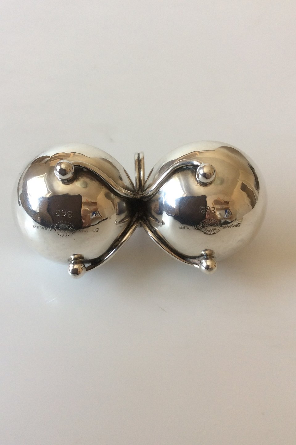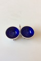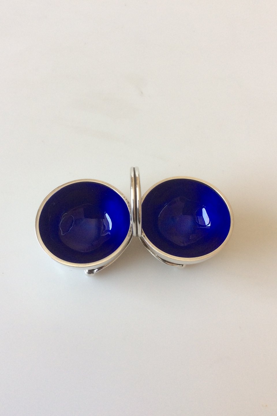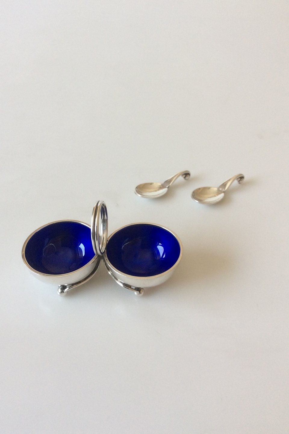 Georg Jensen Sterling Sølv/Blå Emalje Dobbelt Saltkar No 862 med to skeer No 110. Måler 7 x 4 x 3,5 cm