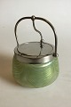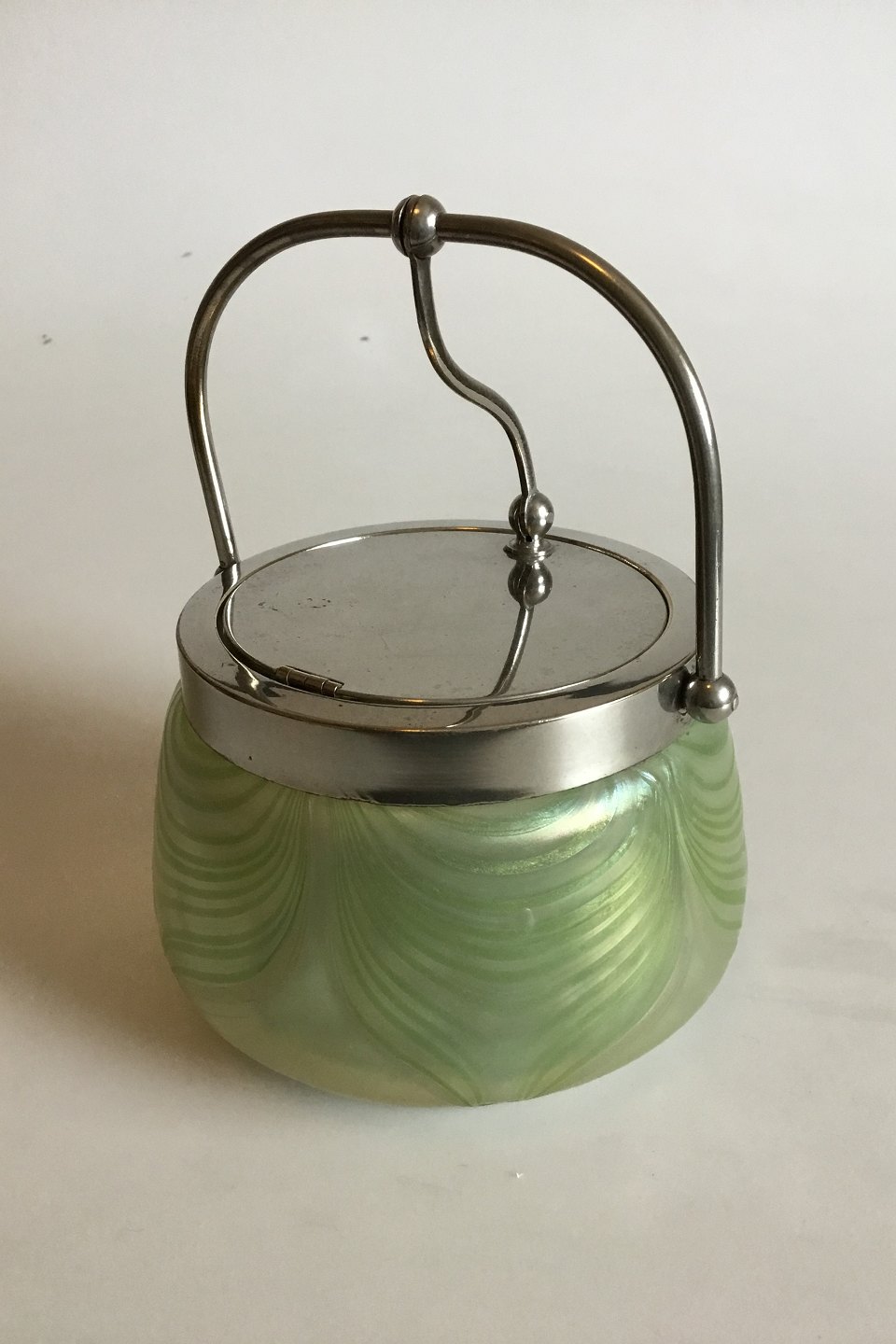Art Nouveau Sugar Bowl/Bonbonniere in light green iridescent glass with silver-plated lid. Presumably from the Loetz glass factory in Bohemia. From the beginning of the 20th century. In fine condition.