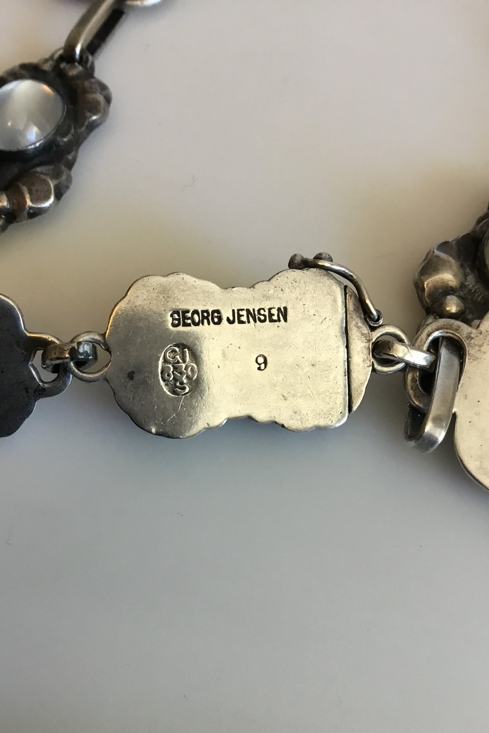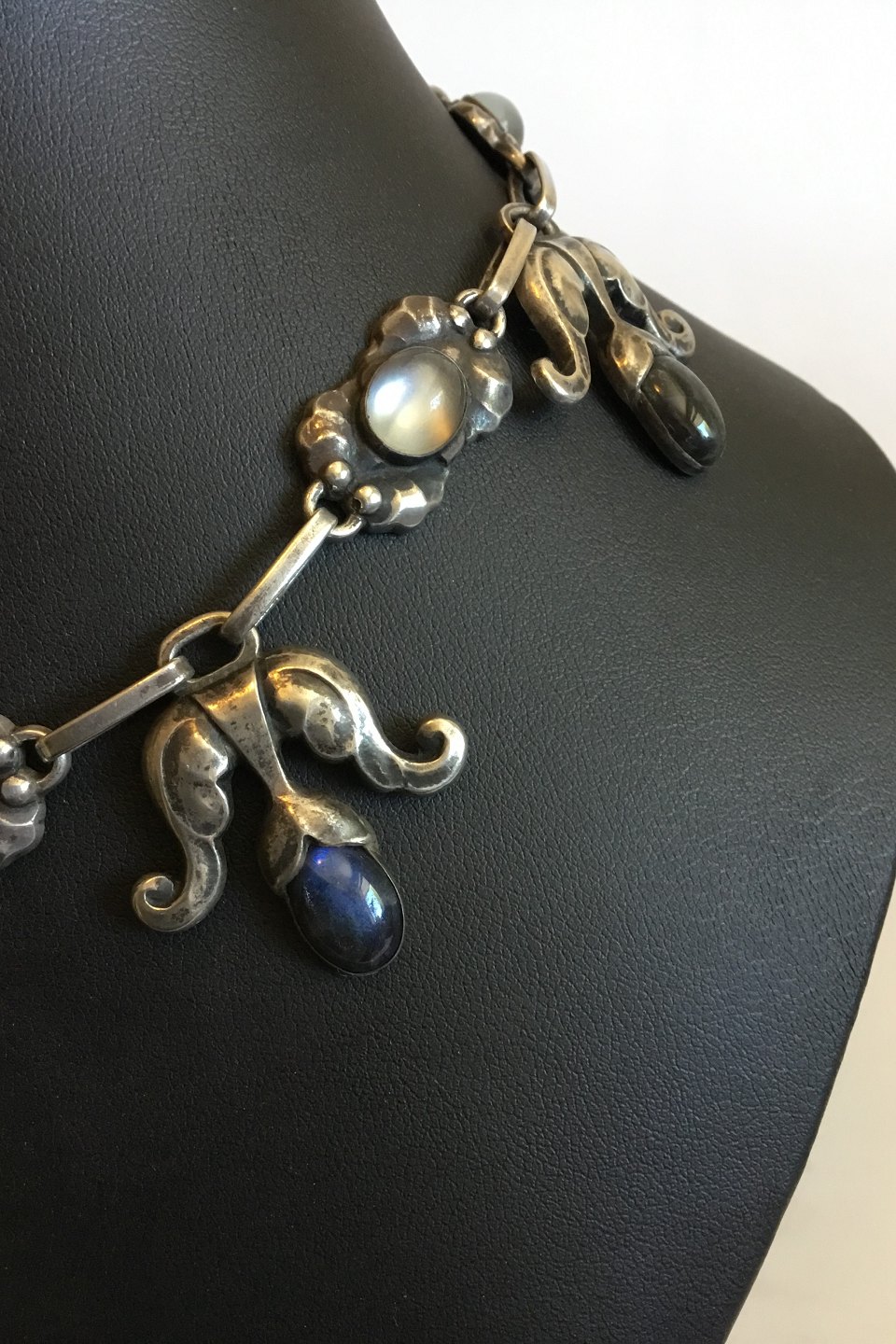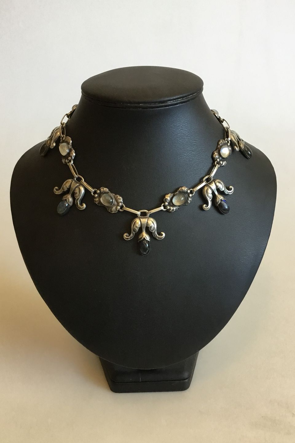 Georg Jensen Silver 830S Necklace No 9 with Moonstones and Labradorites. Measures 39.5 cm / 15 35/64 in. Weighs 60 g / 2.10 oz.