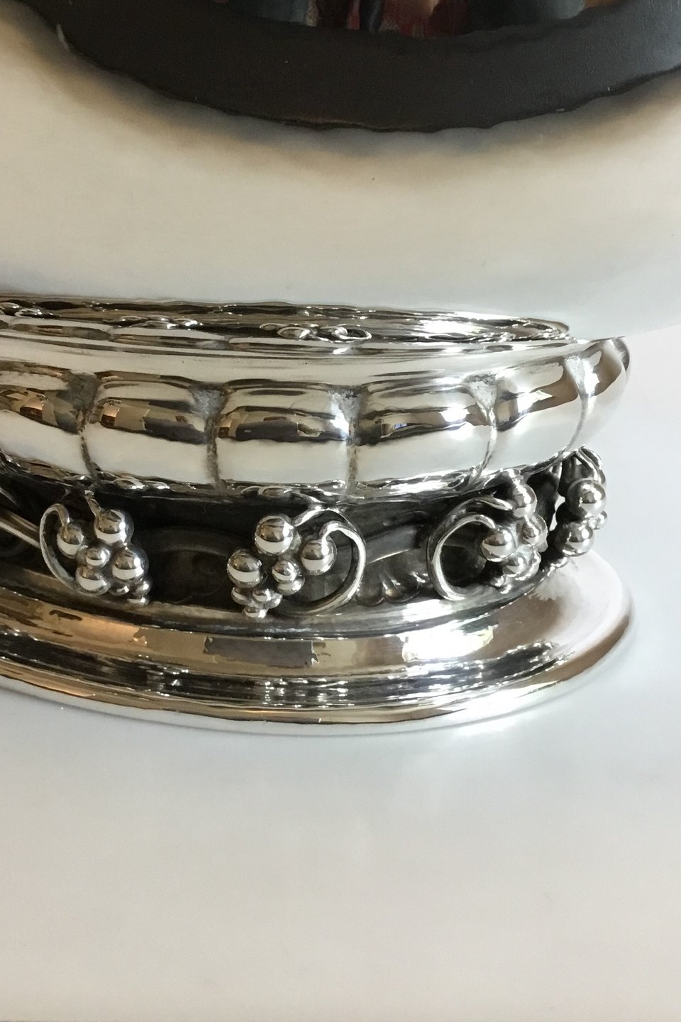 Georg Jensen Hammered Sterling Silver Oval Centerpiece Bowl with Grape motif No 296B. Designed by Georg Jensen 1919. Measures 27.5 cm x 20.5 cm x 10.5 cm / 10 53/64 in. x 8 5/64 in. x 4 9/64 in. Weighs 1052 g / 37.10 oz.