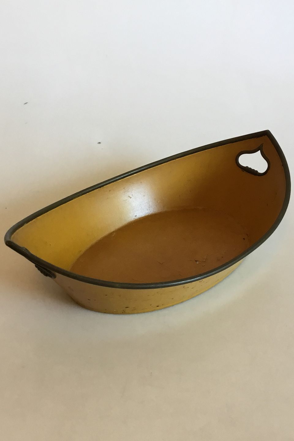Engelsk brødbakke af gullakeret metal. Måler 31,5 cm x 19,5 cm