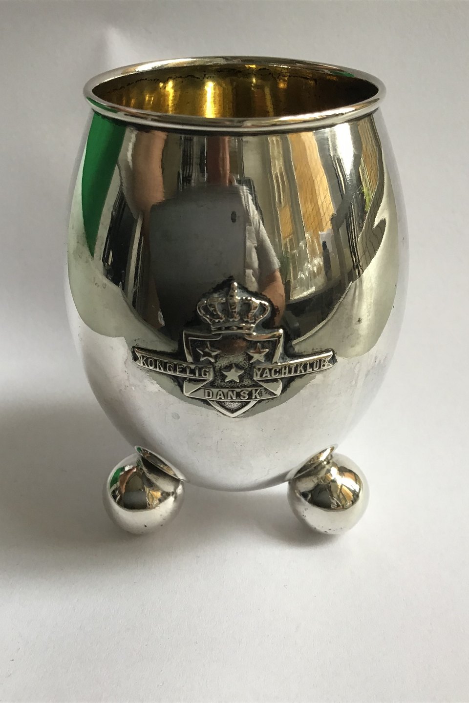 A Dragsted Silver Beaker Eggshaped on 3 ball feet, "Kongelig Dansk Yachtklub"(Royal Danish Yachtclub)Gilded inside. H 8.5 cm/3.34 "84.3 gr/2.97 oz.