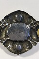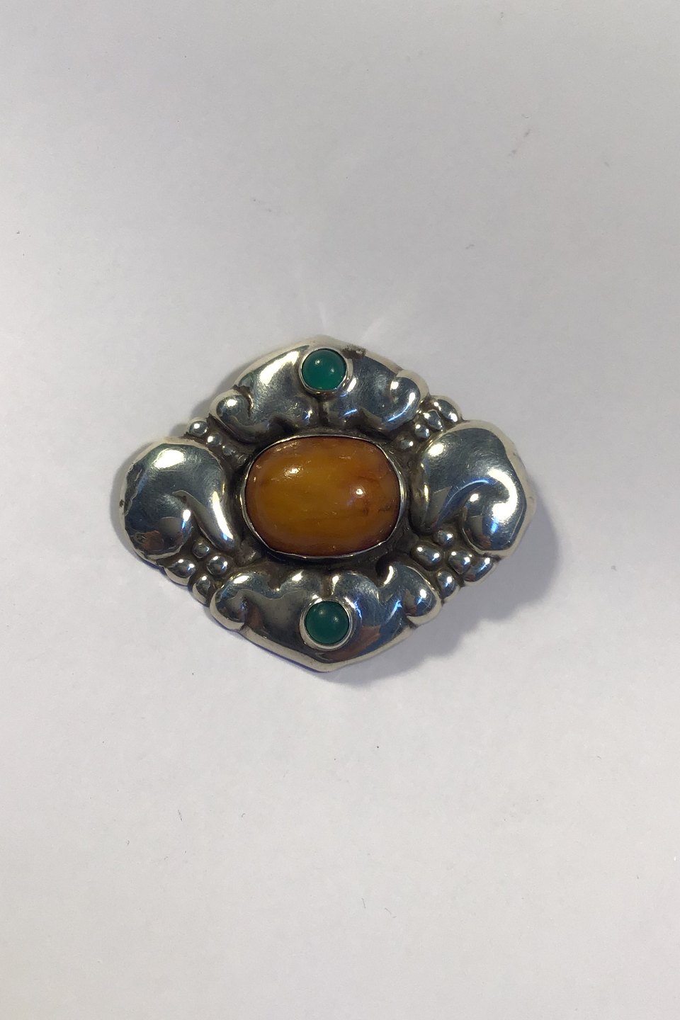 Evald Nielsen Sølv Broche, Ravcenter flankeret af grønne sten Hægtet delvist fornyet Måler 5,6 cm x 4.6 cm/2.20" x 1.81" Vægt 13.1 gr/0.46 oz