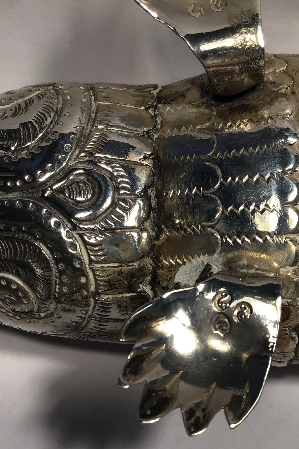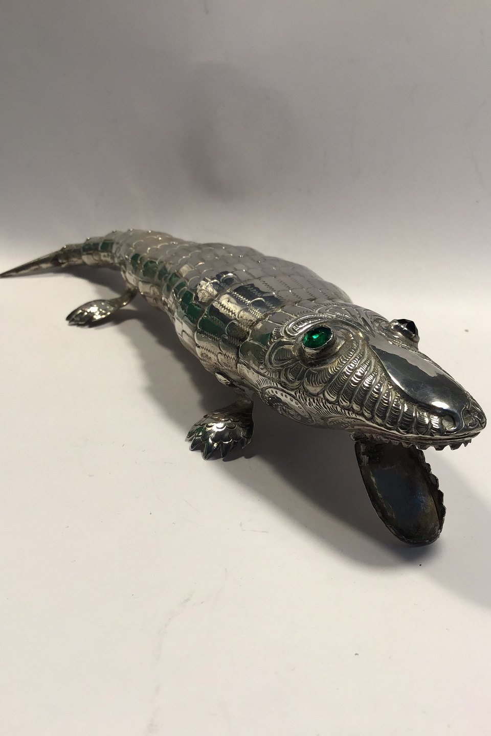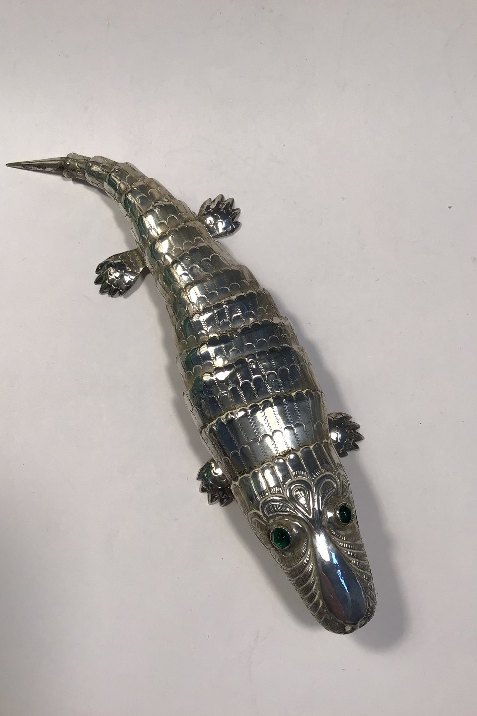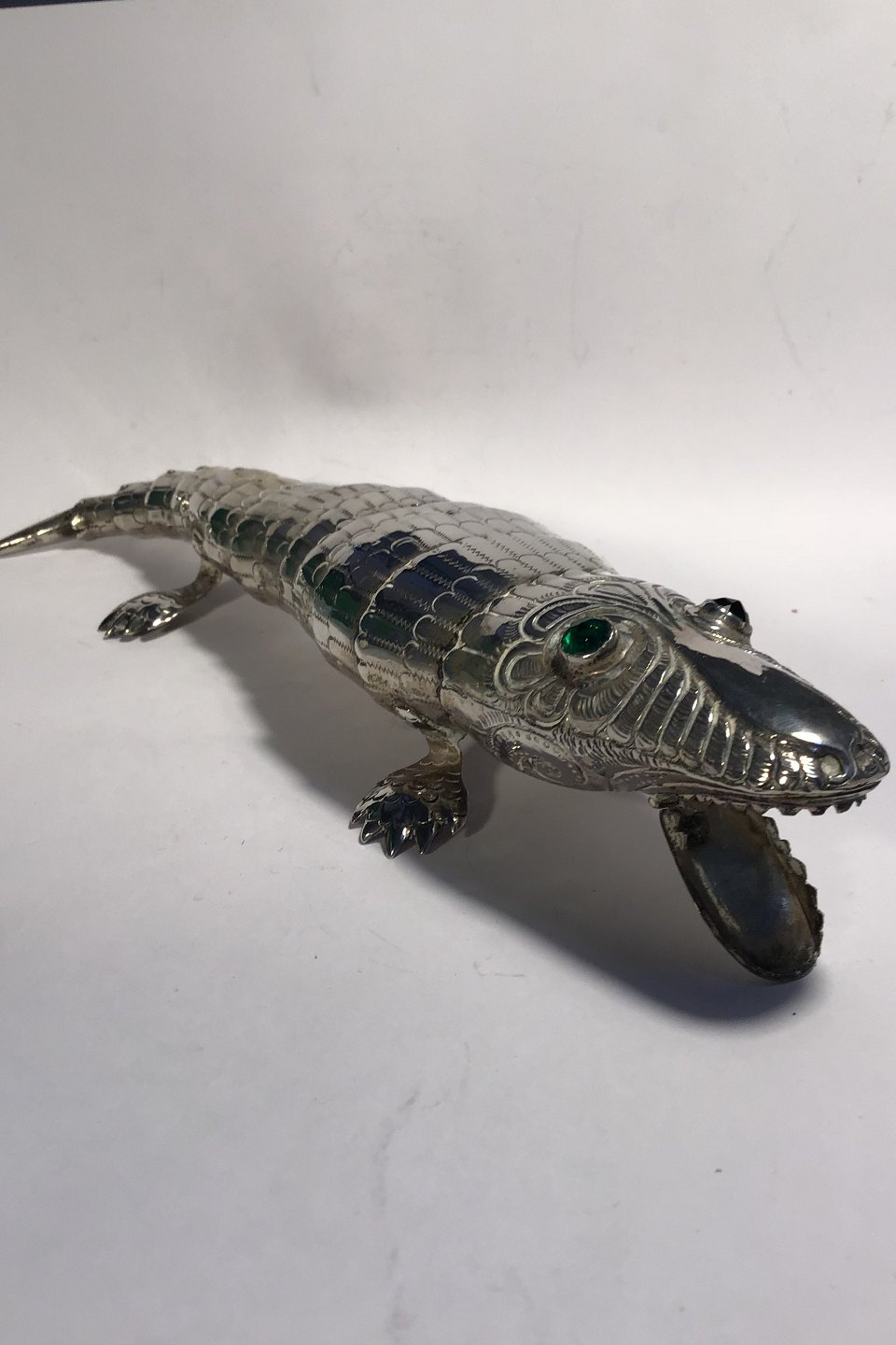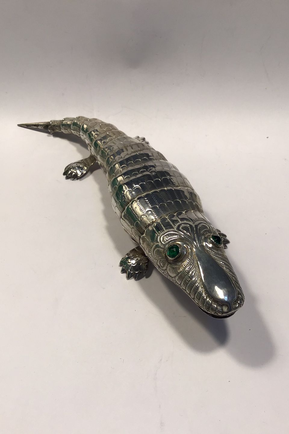 Alligator / Krokodille i sølv med bevægelige led. Grønne flus-øjne L 21.5 cm