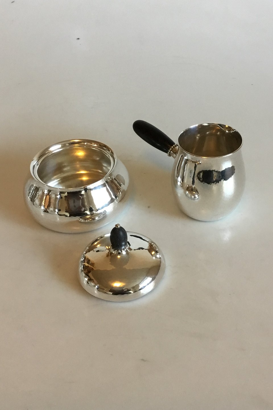 Georg Jensen Sterling Silver Sugar Bowl and Creamer with Ebony Handles No 80C. Measures Sugar Bowl 8.5 cm / 3 11/32 in. Creamer 7.5 c, 2 61/64 in. Weighs 344 g / 12.15 oz.