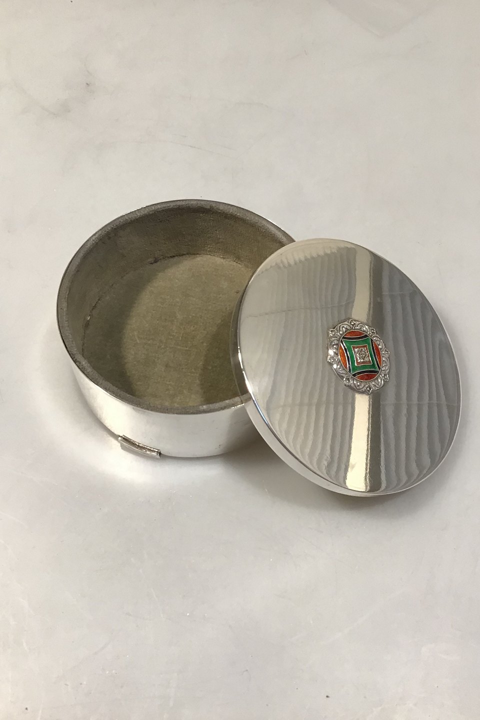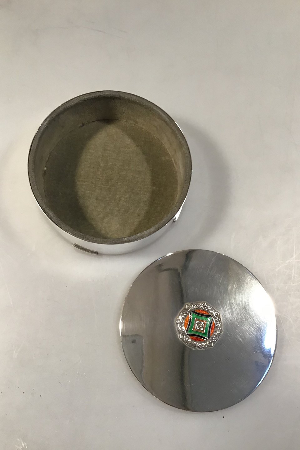 Norsk Sølv Smykkeskrin med emalje dekoration Sølvsmed Thune, Oslo 830 Sølv Diameter 10 cm H 4.2 cm Vægt 210 gr