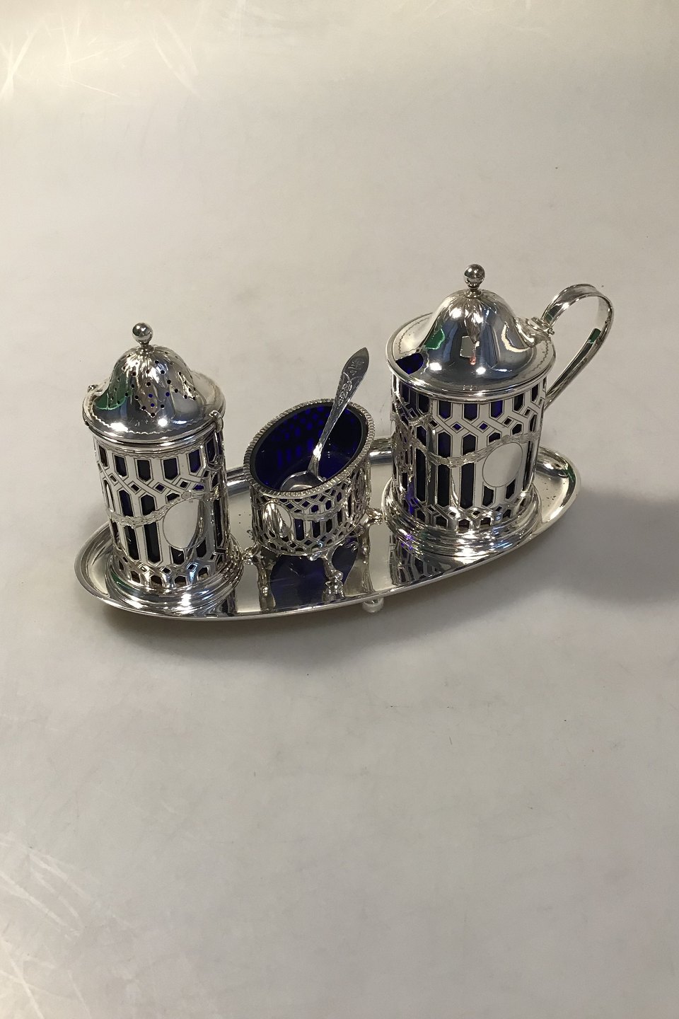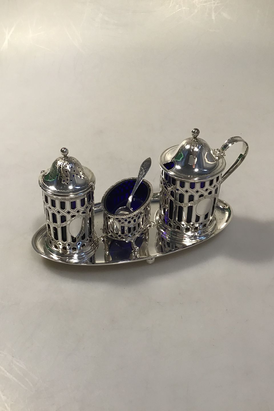 P. Hertz Sølv Plat-de-ménage Sennepskrukke, Peberbøsse og saltkar samt bakke Med blå glasindsats og saltske Lidt korrosion på bakke Graveringer Vægt samlet 375 gr/13.26 oz