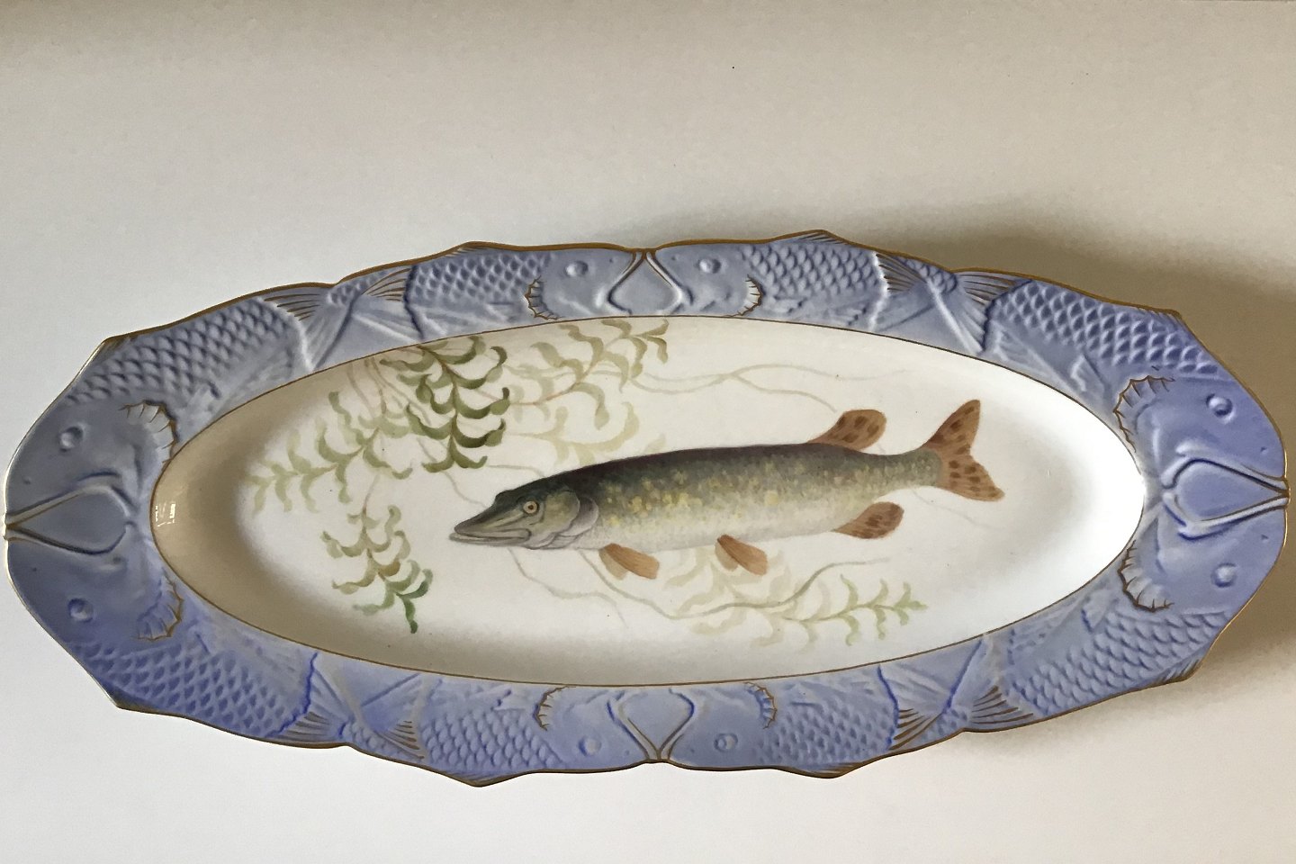 Royal Copenhagen Blå Fiskefad med Guld No 3001med Esox Lucius Måler 60 cm x 26 cm