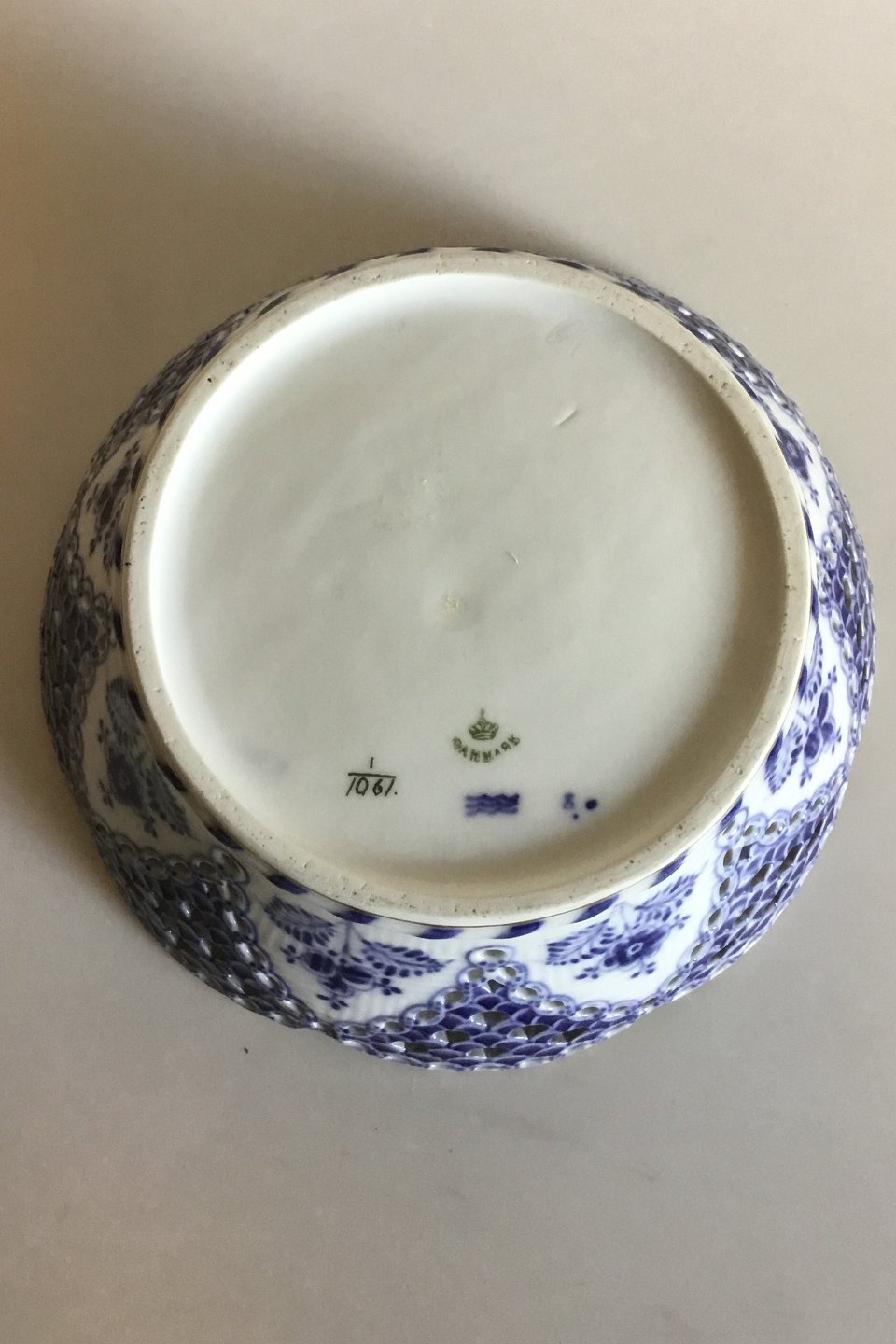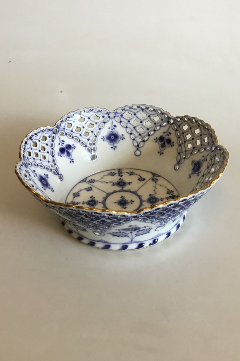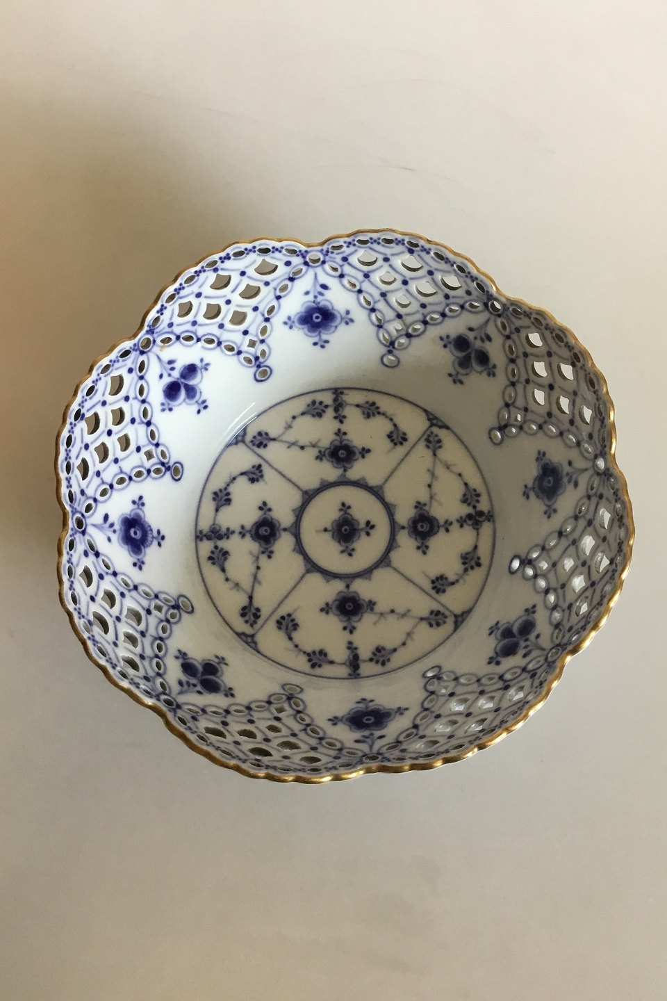 Royal Copehagen Blue Fluted with Gold Round Fruit Basket No 1/1061. Measures 9 cm / 3 35/64 in. x 23 cm / 9 1/16 in. dia.