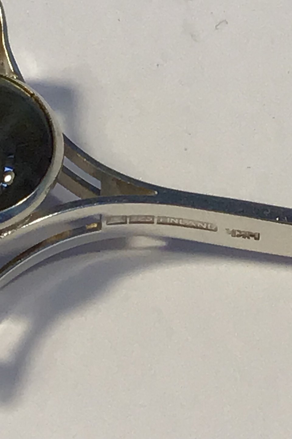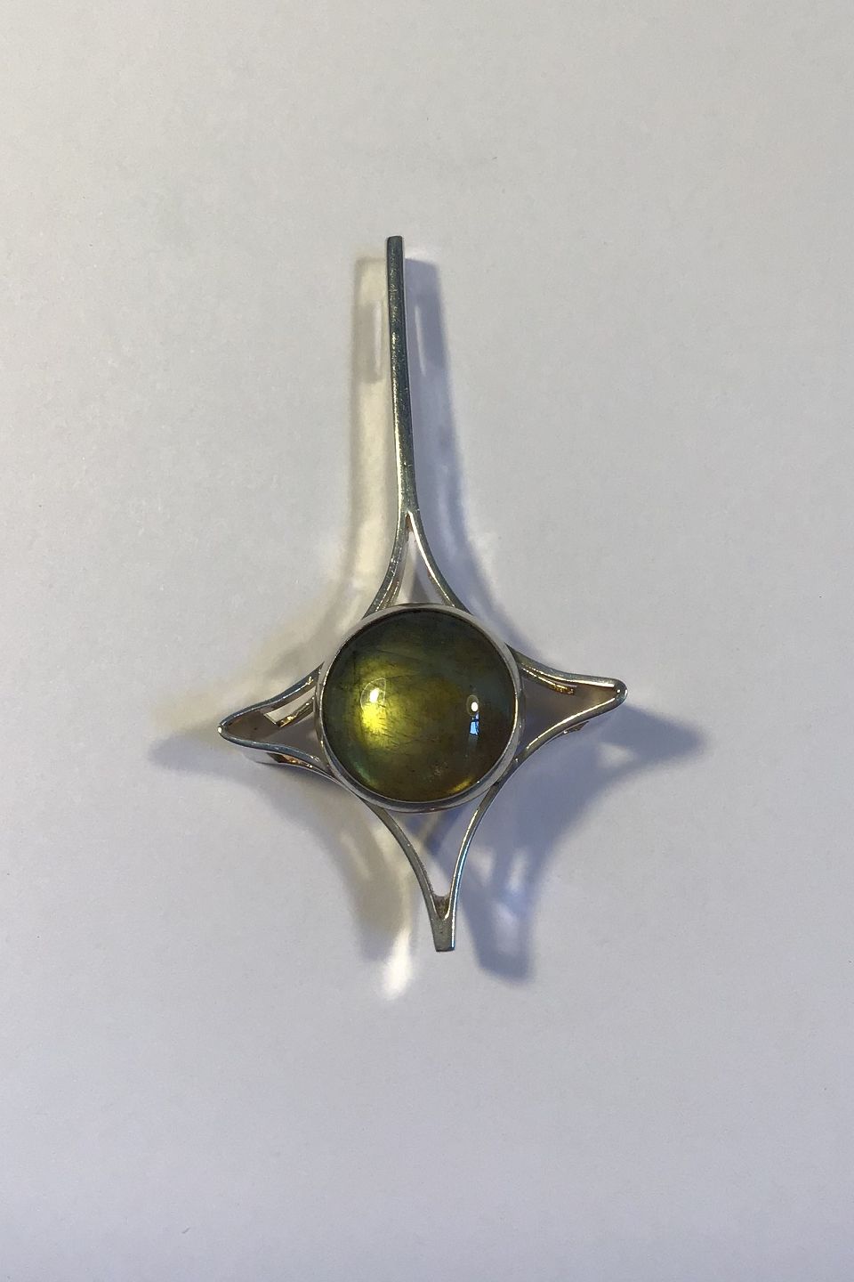 Finsk Sterling Sølv Vedhæng med olivenfarvet sten Måler 5.6 cm x 3.0 cm Vægt 6.7 gr
