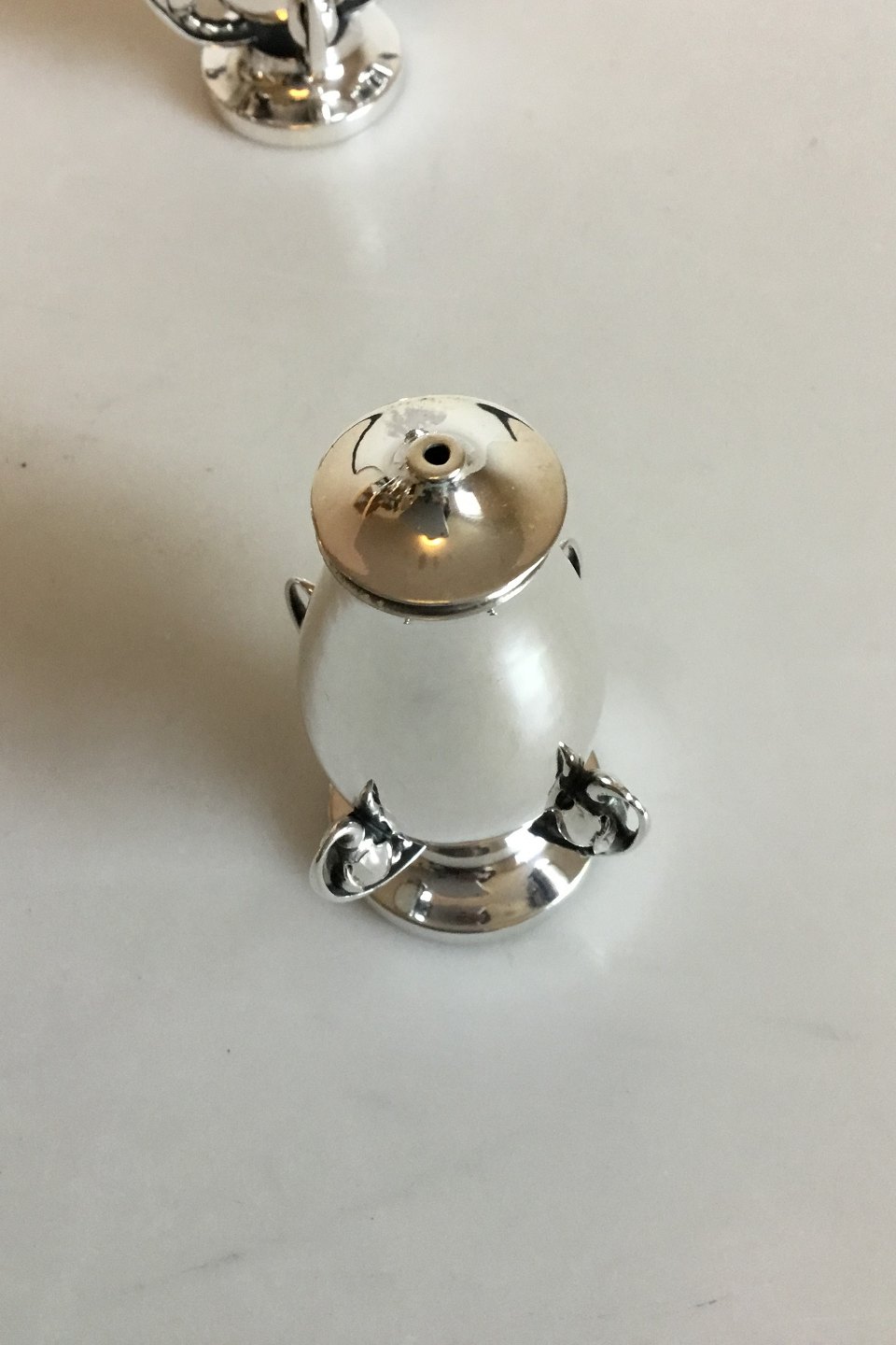 Georg Jensen Sterling Silver Magnolia Salt and Pepper Shakers No 2B. Measures 7.8 cm / 3 5/64 in. Weighs combined 121 g/ 4.25 oz.