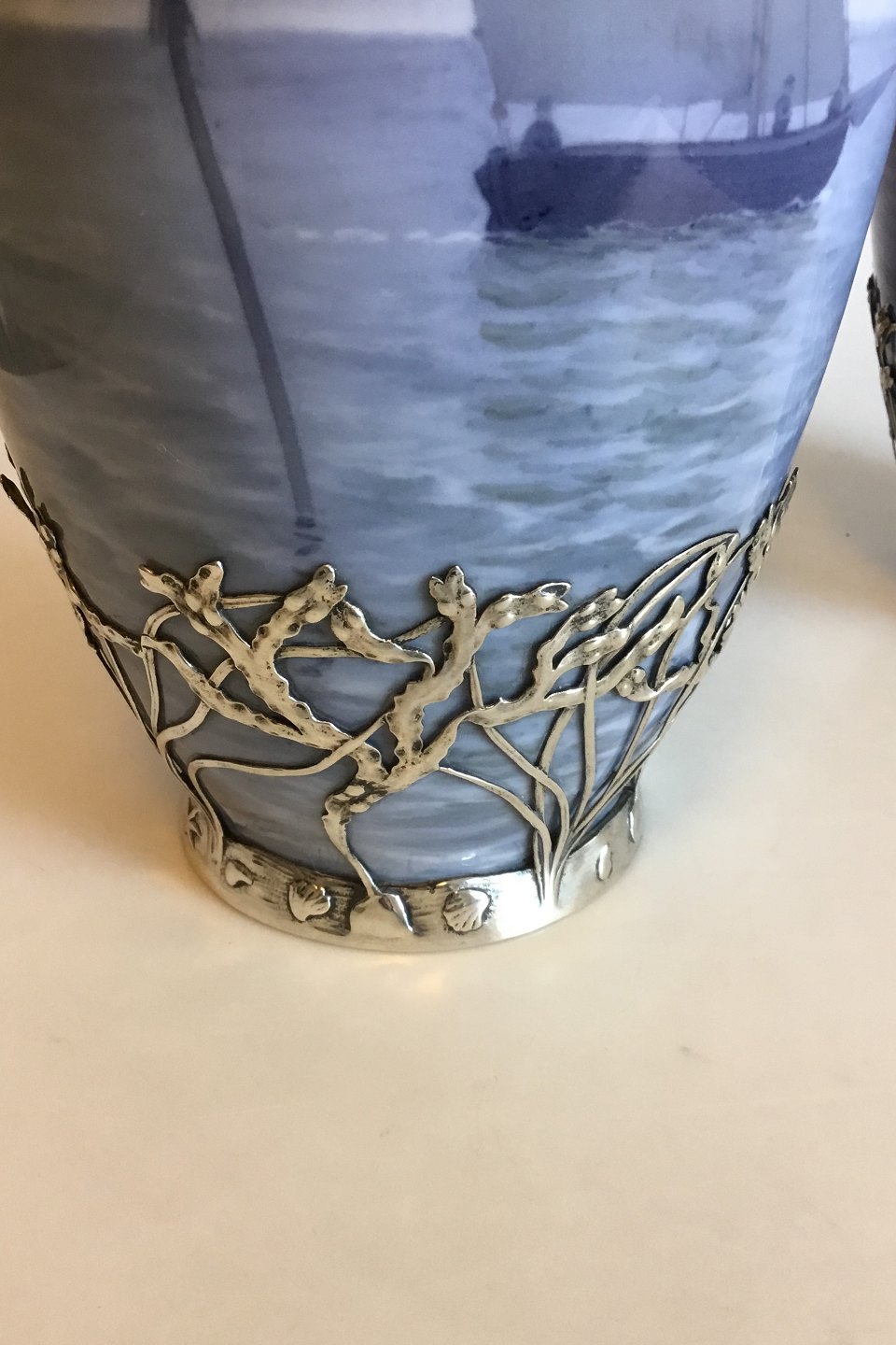 Royal Copenhagen Art Nouveau Et par vaser dekorerede med skibe og Sterling sølvmonteringer stemplet Michelsen ER 1916 No 1438/763 og 1462/763. Måler 36 cm