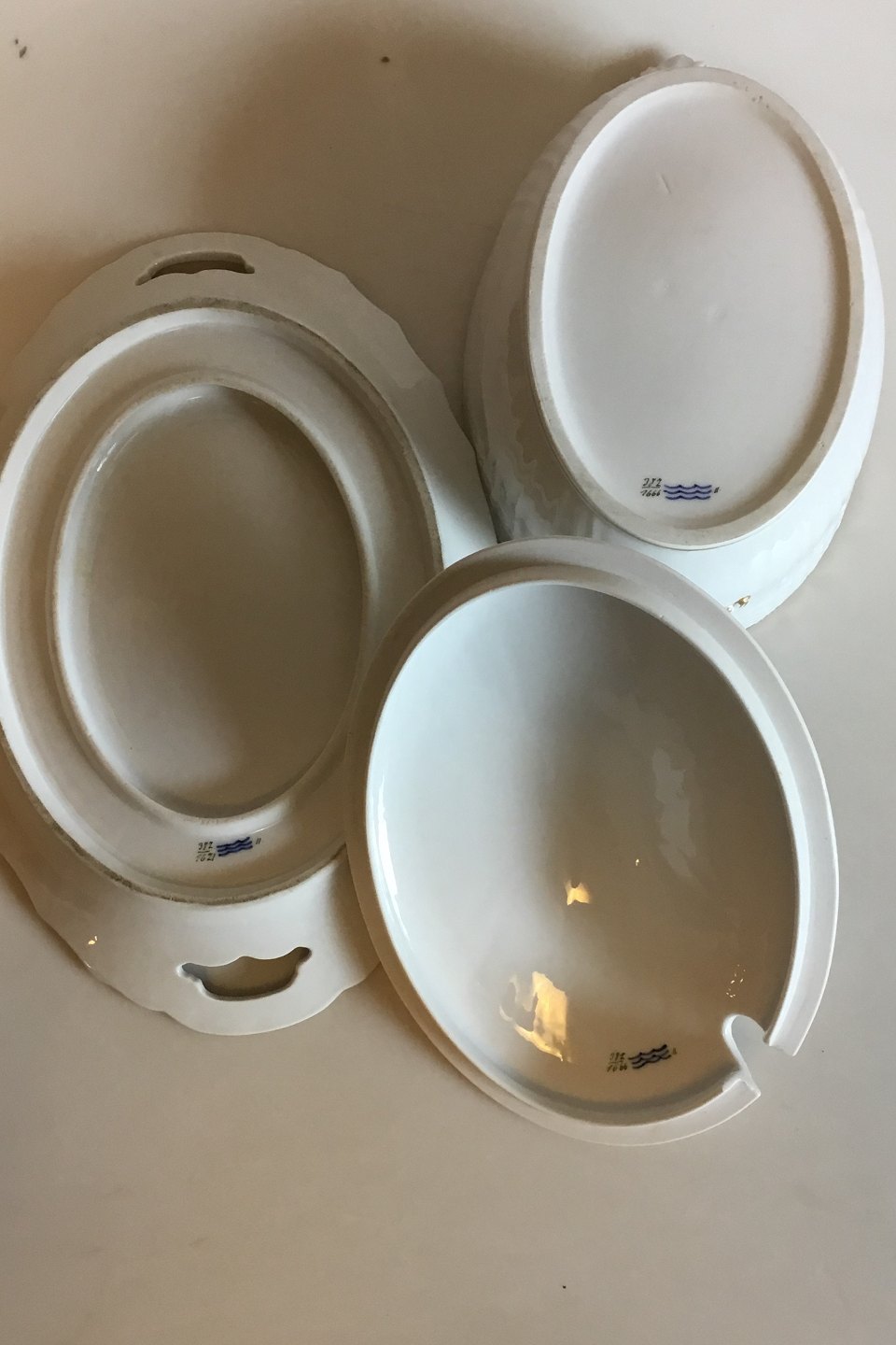 Royal Copenhagen Hvid Svejfet med takket guldkant(Stel 387/ Josephine) Oval terrin med underfad No 1666. Måler 21 cm x 39 cm