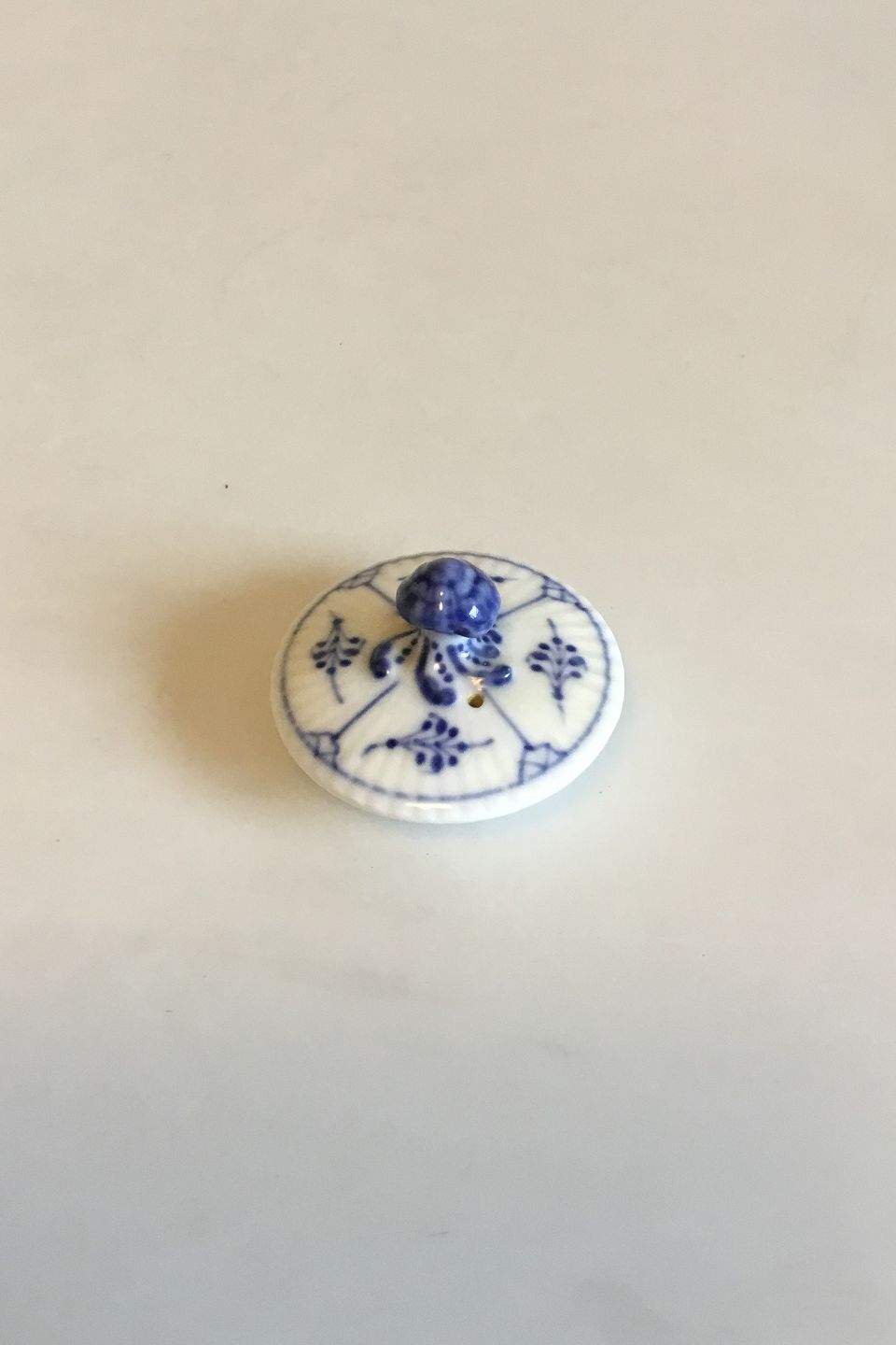 Royal Copenhagen Musselmalet Riflet Låg til Thekande No 250. Måler 6 cm