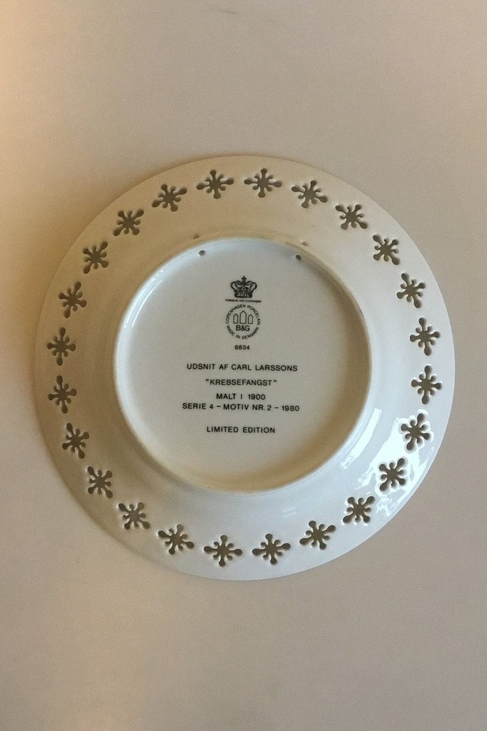 Bing & Grondahl Carl Larsson plate "Crab catch" Series 4, No 4, 1980. Measures 21.5 cm / 8 15/32 in.