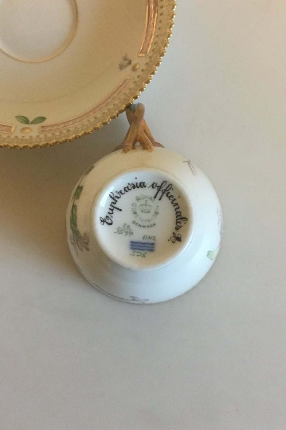 Royal Copenhagen Flora Danica Kaffekop og Underkop No 20/3597. Latinsk Navn: Eupharasia officinalis L. Måler Kop: 7 cm x 7,5 cm dia. Underkop: 13,8 cm