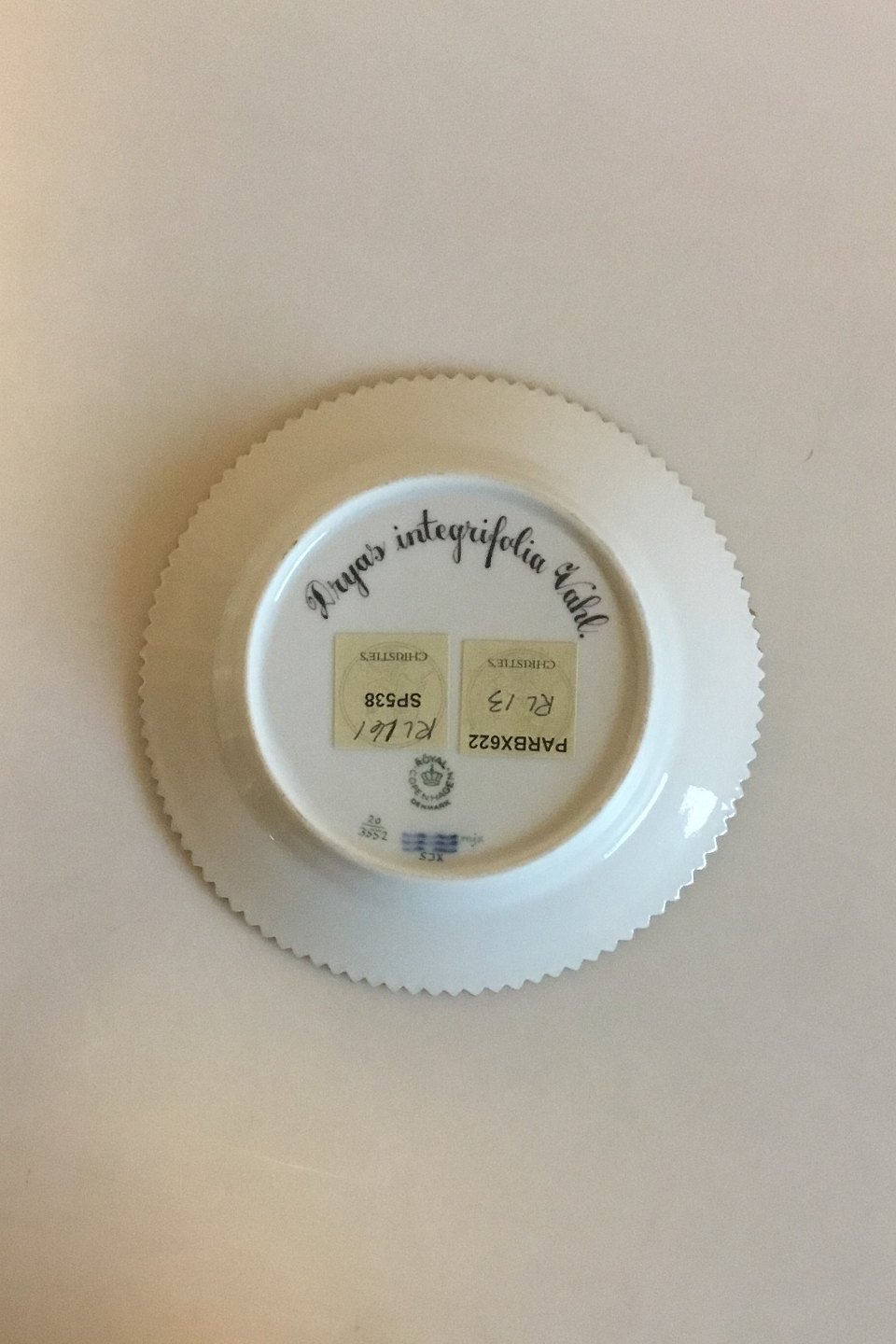 Royal Copenhagen Flora Danica Kagetallerken No 20/3552. Latinsk tekst: Dryas integrifolia Vahl. Måler 14,3 cm.