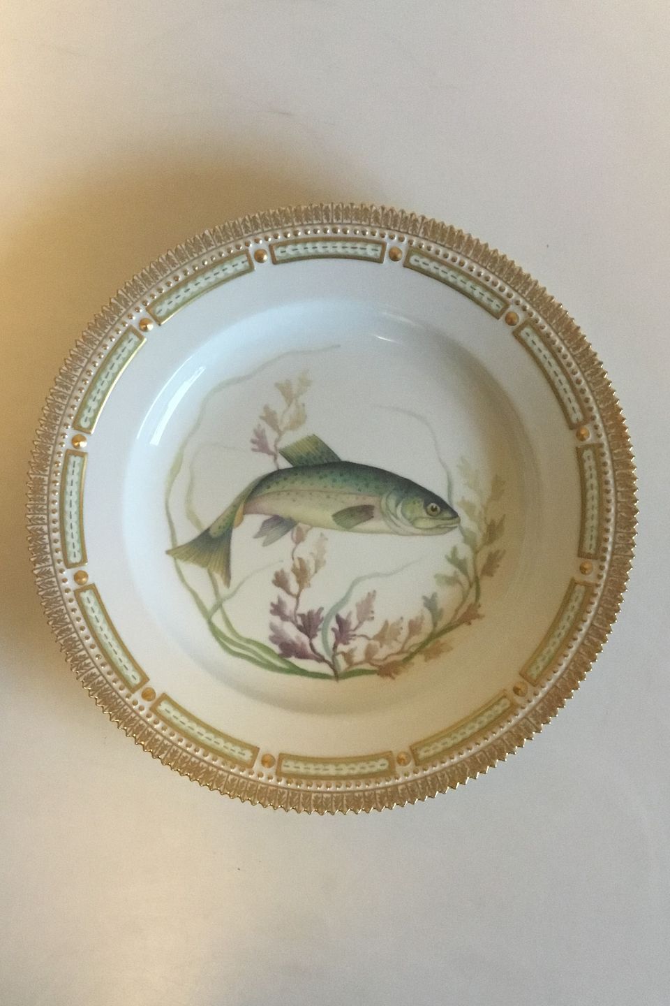 Royal Copenhagen Flora Danica Fisketallerken No 20/3549. Latinsk navn: Salmo trutta. Måler 25,8 cm