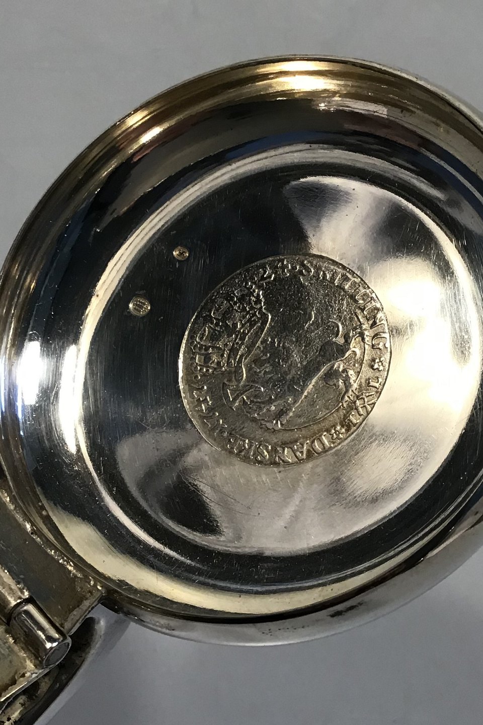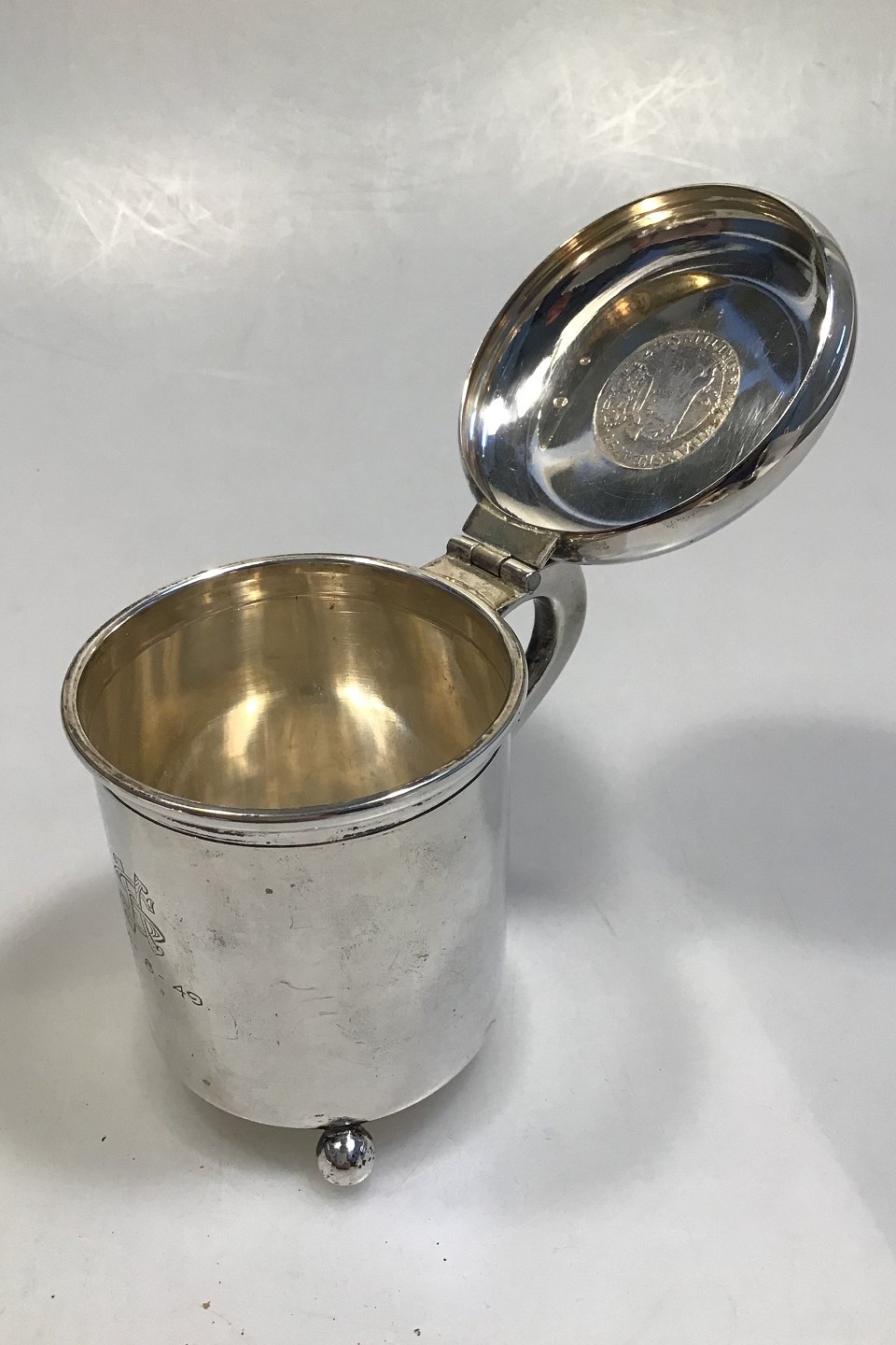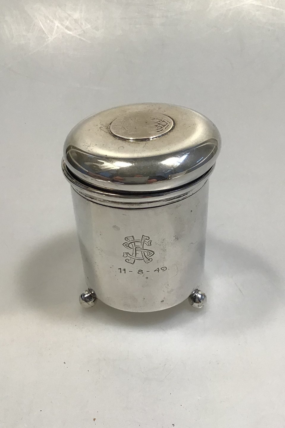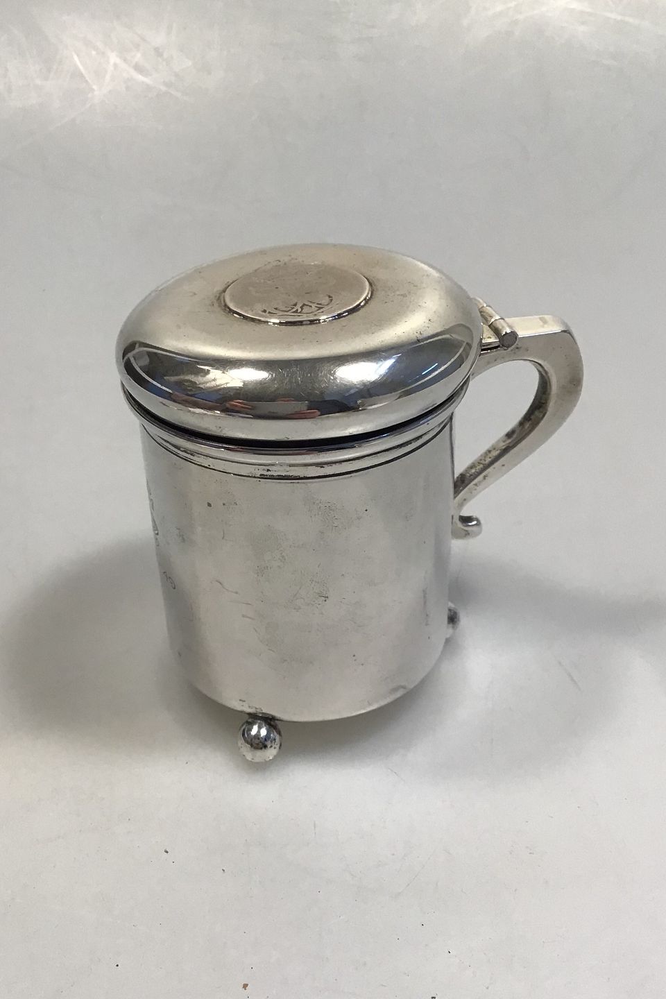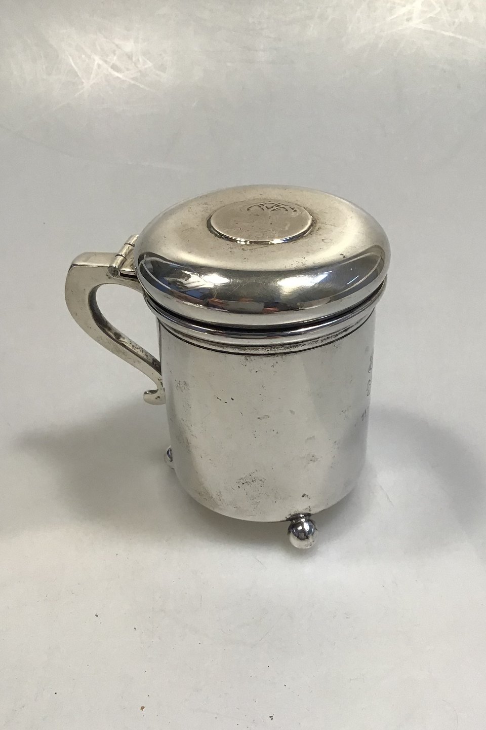 Ole Johansen Sølv Lågkrus Måler Diam 7.2 cm H 9.5 cm Vægt 183.6 gr Med Kuglefødder, Norsk 24 Skilling 1747 og gravering
