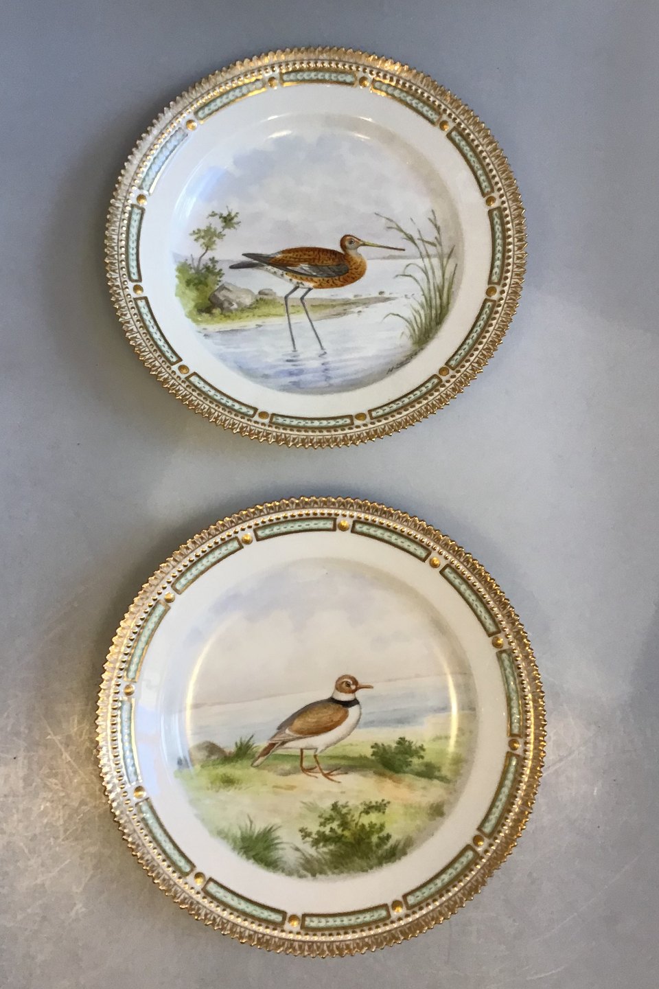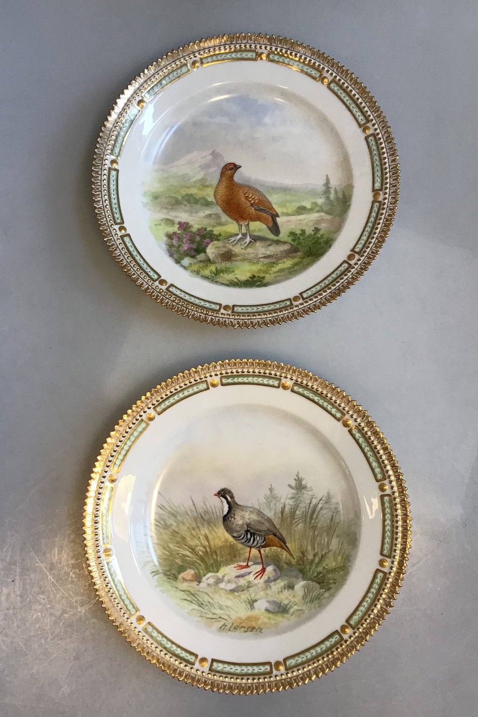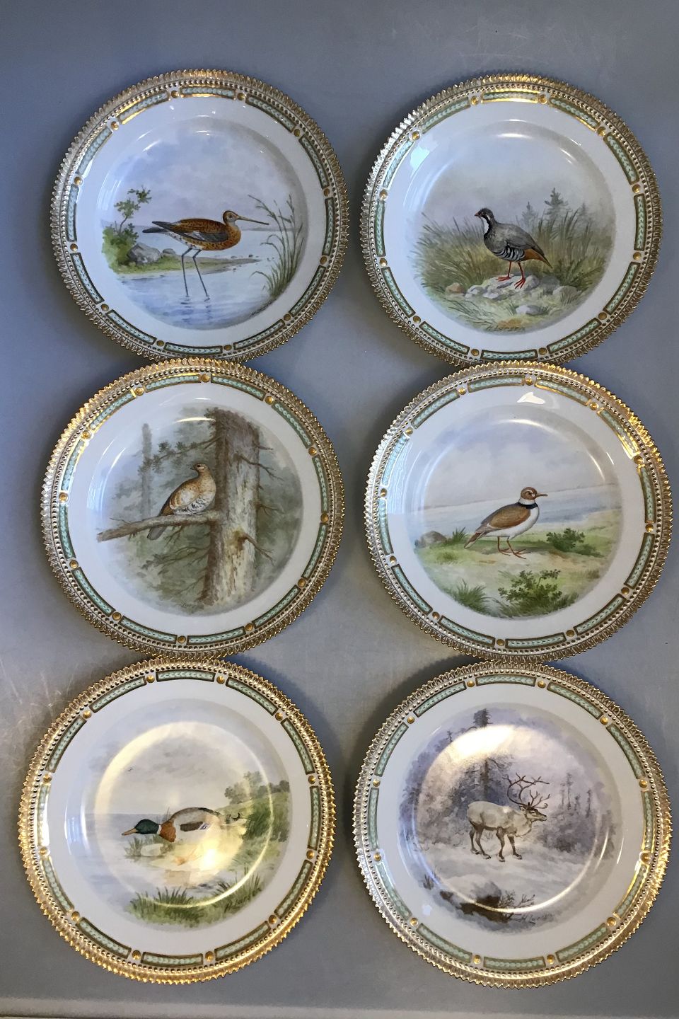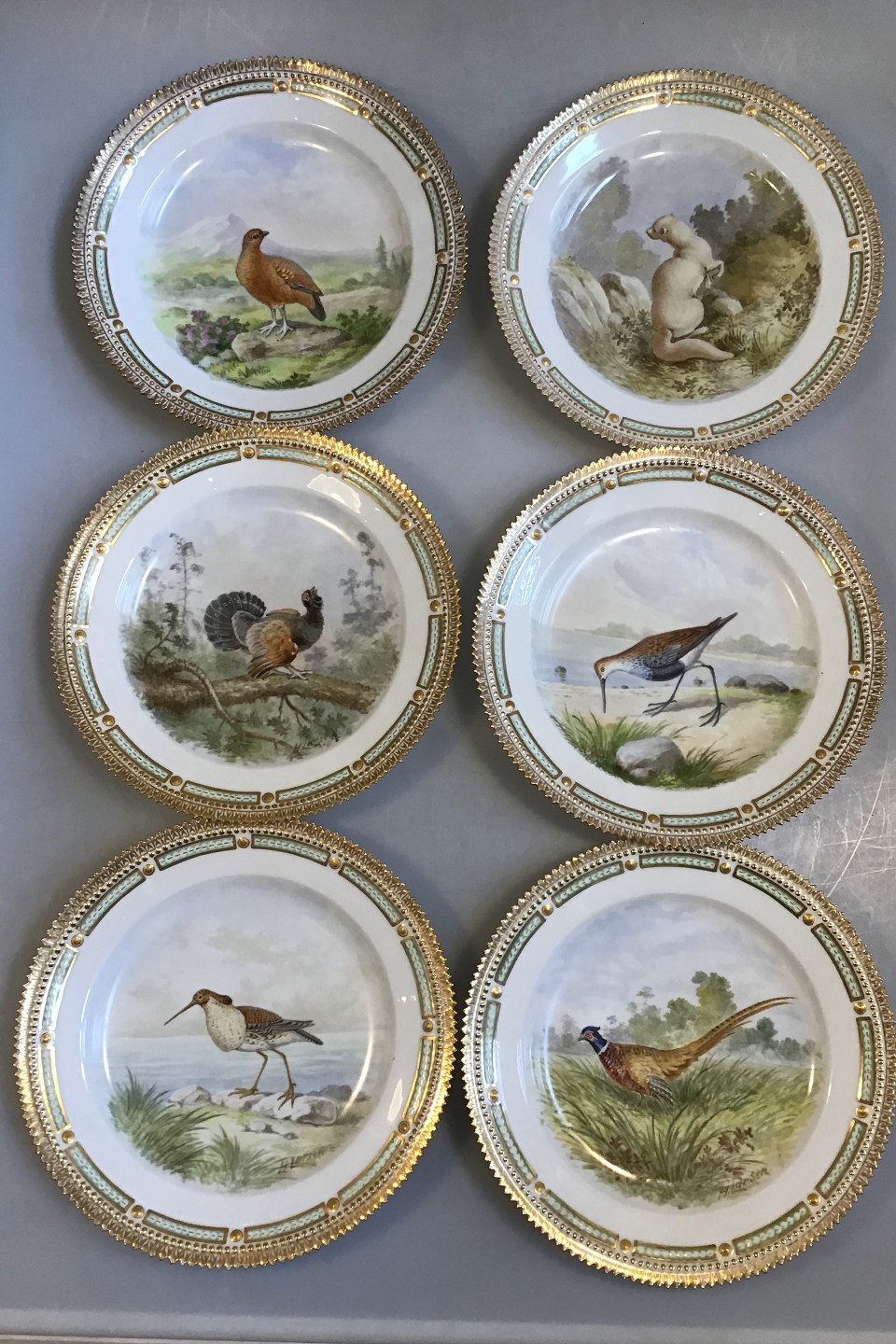Royal Copenhagen Flora Danica/Fauna Danica Animal Luncheon Plates No 240/3550 (Set of 12) Measures 22 cm(8 21/32 in) Latin Names: Putorius furo, Tarandus rangifer, Tetrao urogallus, Machetes pugnax, Tringa alpina, Phasianus colchicus, Lagopus albus, Caccabis rubra, Tetrao urogallus, Anas boschas, Limosa melanura and Haematopus ostrealegus. Painter H Larsen