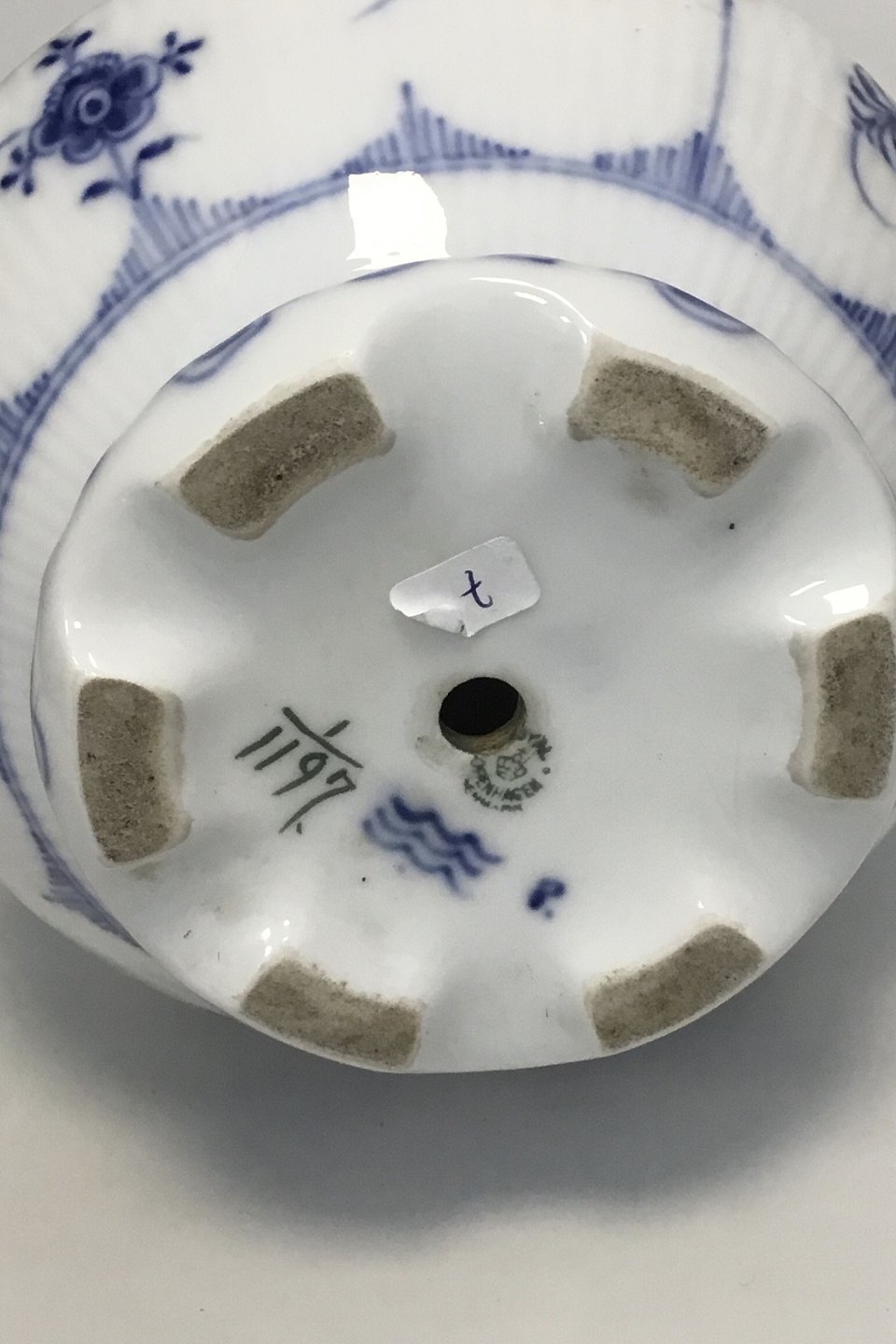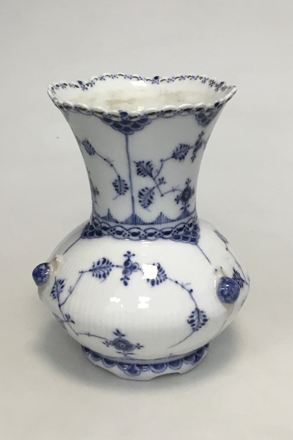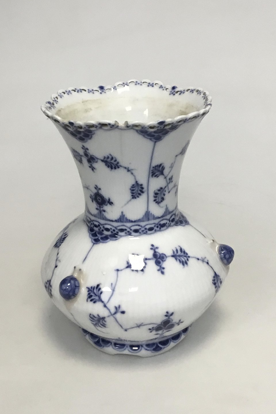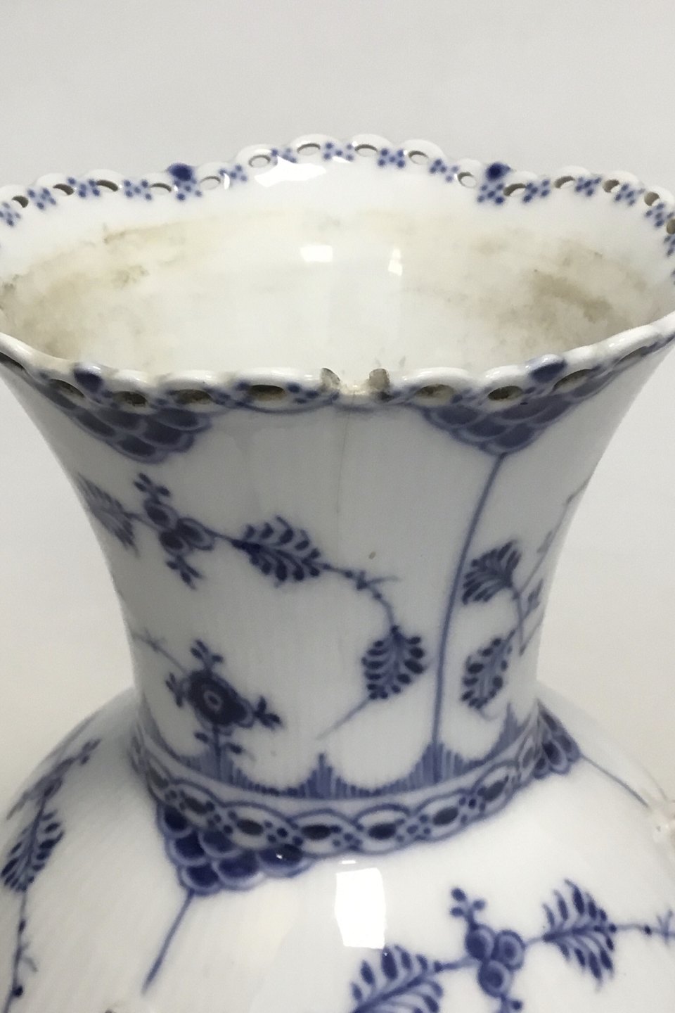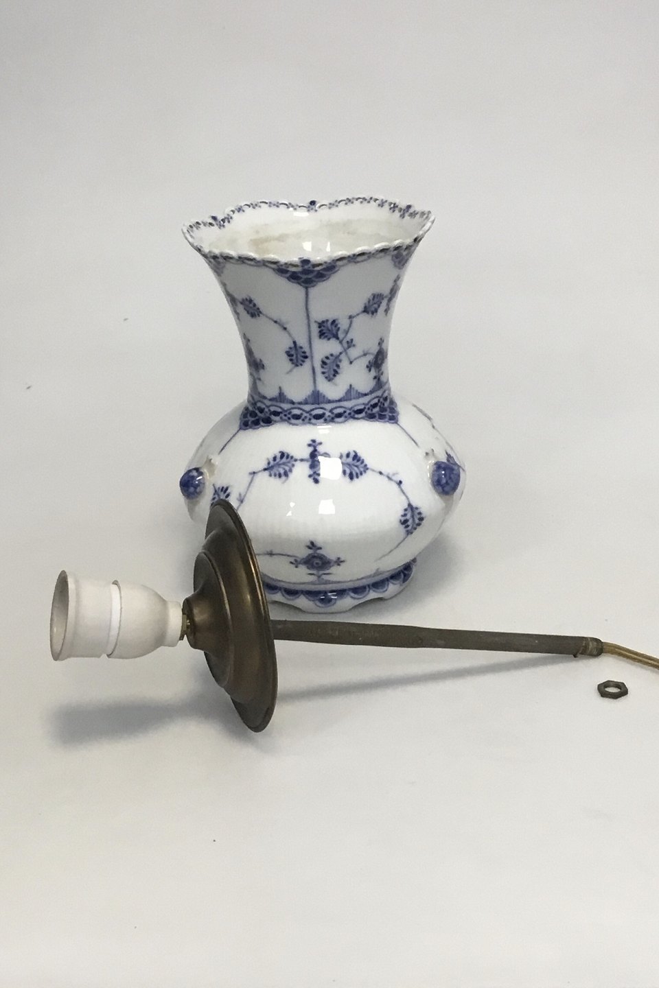 Royal Copenhagen Blue Fluted Full Lace Vase no. 1197. H: 21.5 cm (8 15/32"). Damage on the rim as seen on photo and a 6 cm (2 23/64") hair line in connection with the damage. Drilled hole in the base and the vase has been mounted as a table lamp. The old parts for mounting is still with us.
