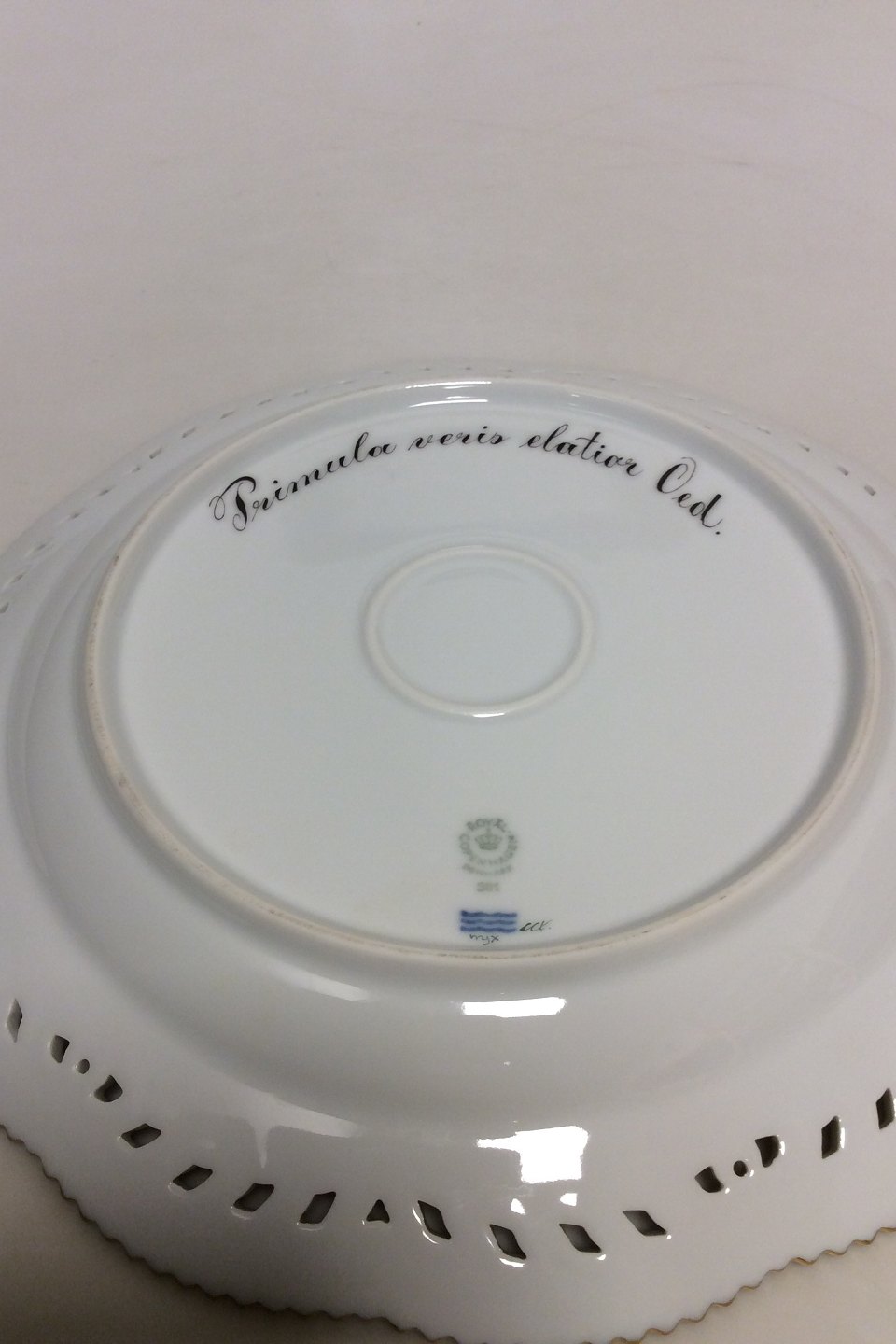 Royal Copenhagen Flora Danica Charger plate with pierced border No 20/3574 or 381. Measures 28 cm / 11 1/32 in. Latin name: "Primula veris elatior Oed."