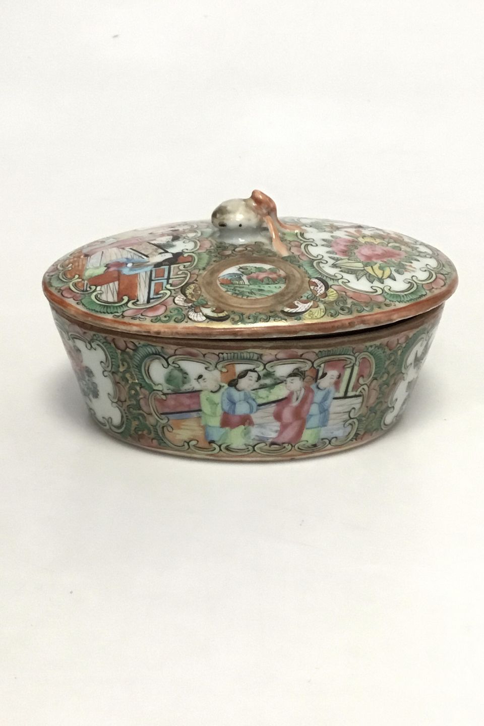 Chinese Canton (gold and green) tureen. Palace scenery and birds and butterflies. Ca. 1850. L: 13 cm (5 1/8"), H: 6,5 cm (2 9/16")