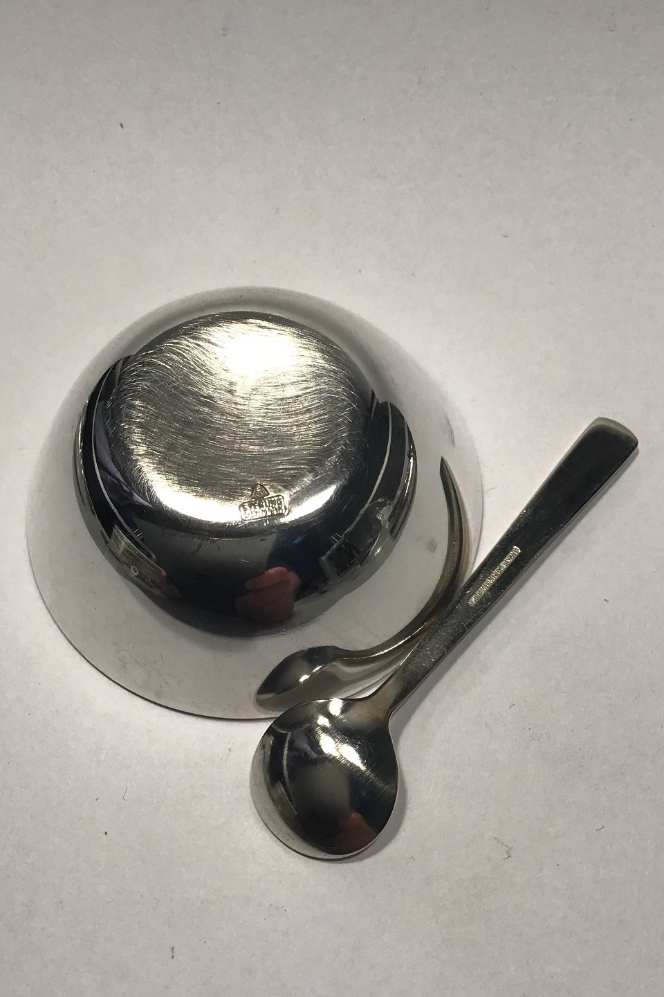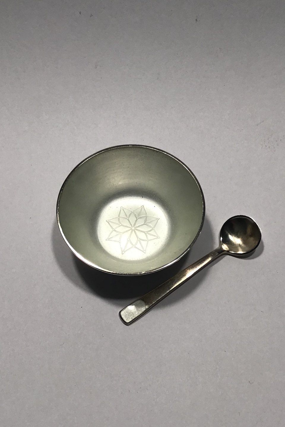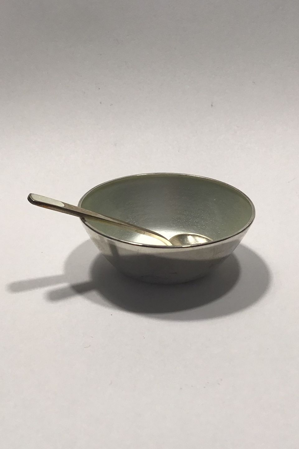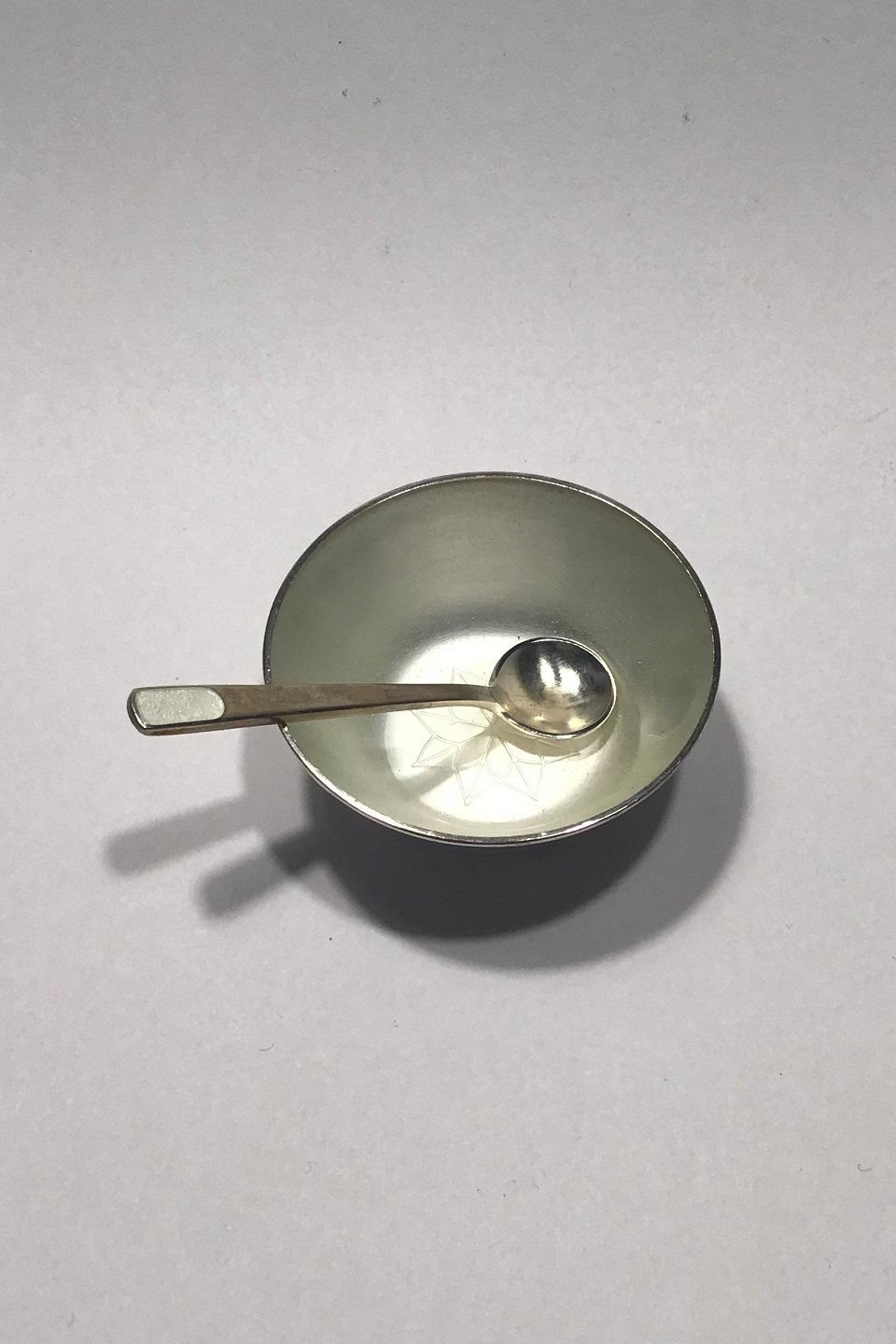 Anton Michelsen Sterling Sølv Saltkar og saltske (Hvid emalje) Måler Diam 5 cm Ske 6 cm Samlet vægt 19 gr