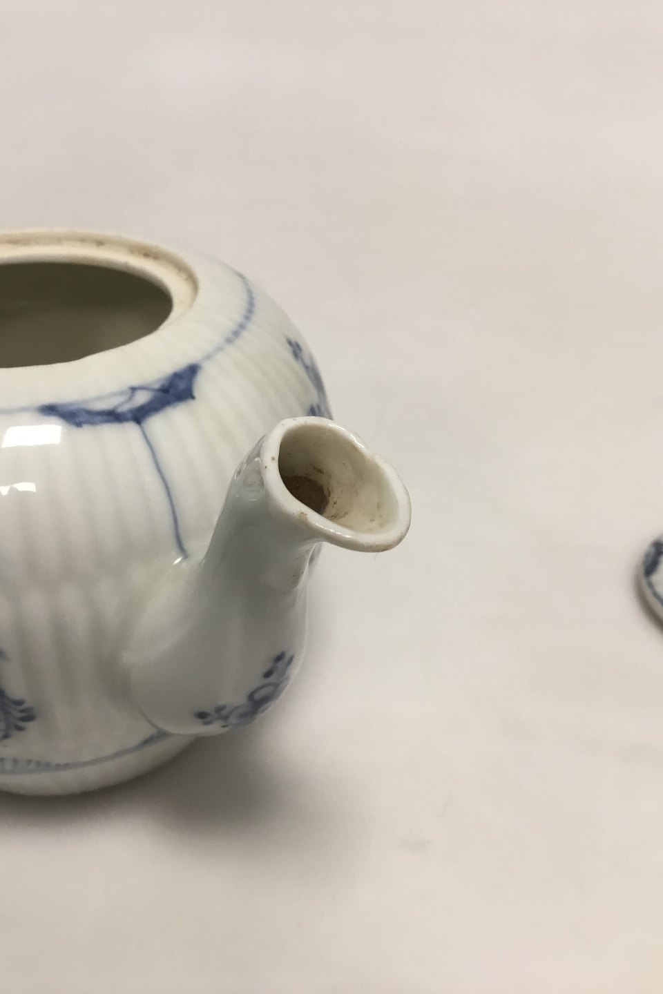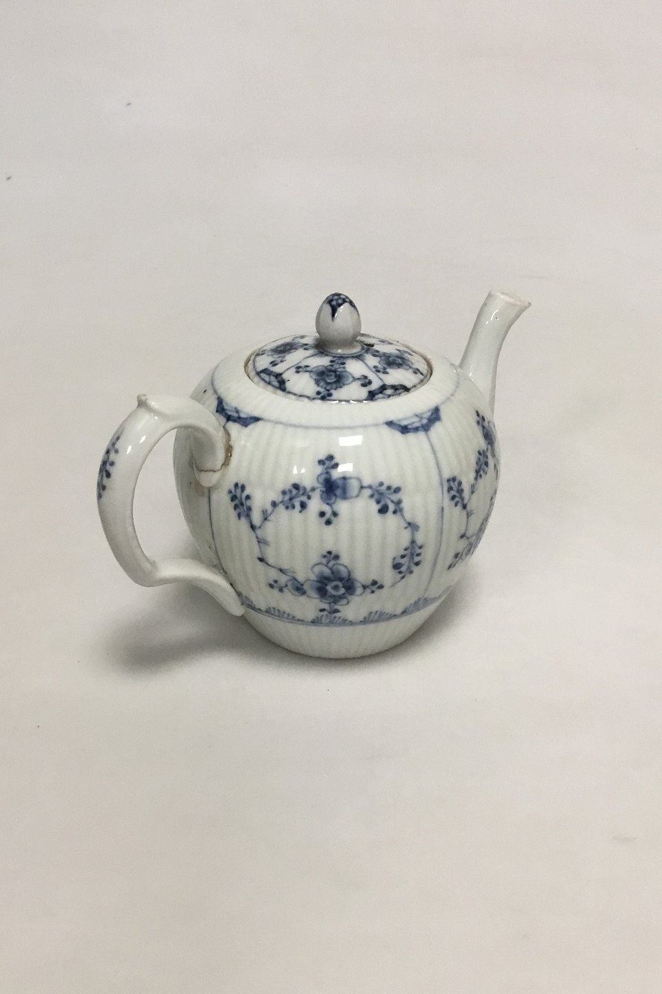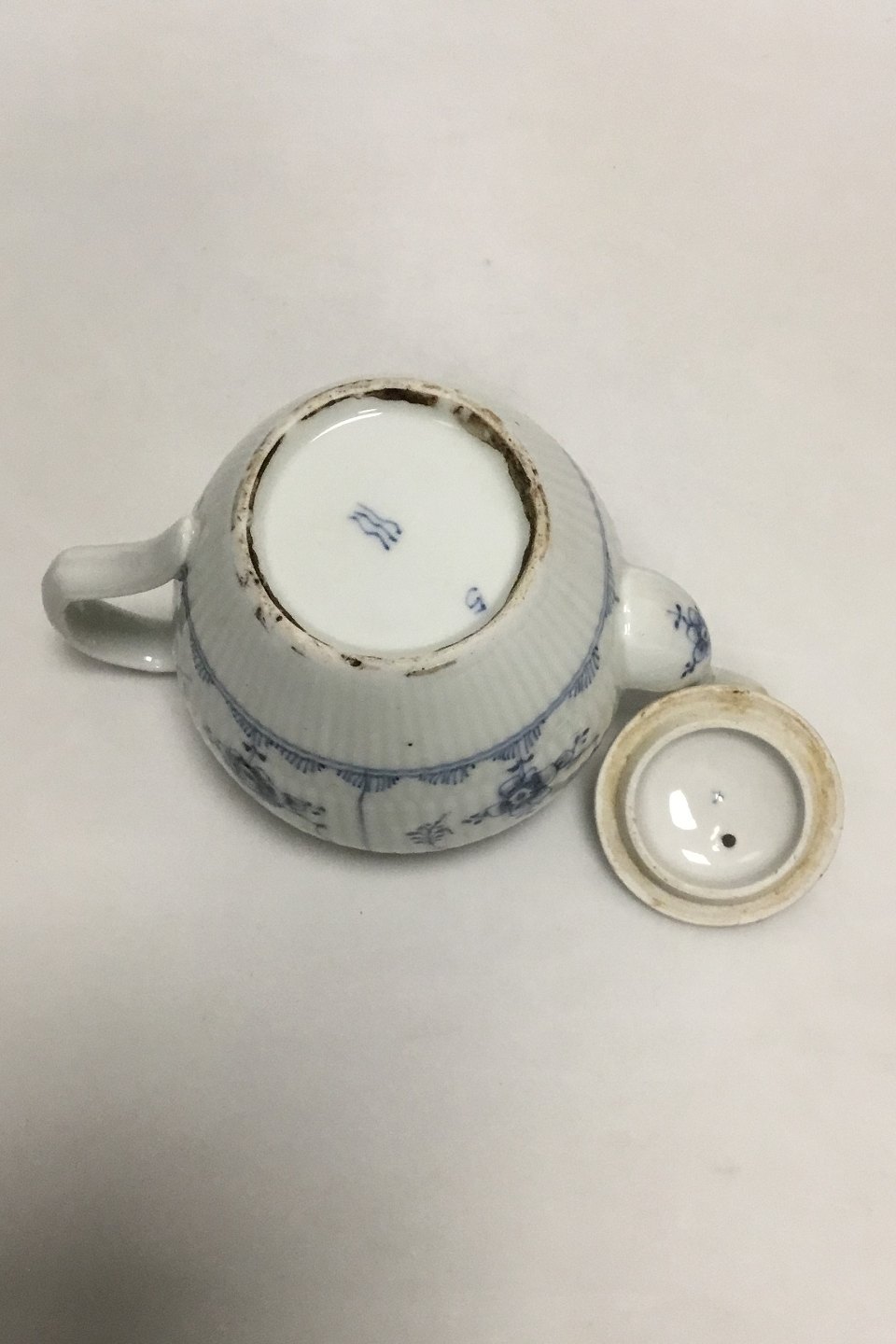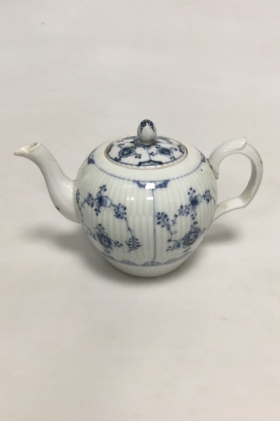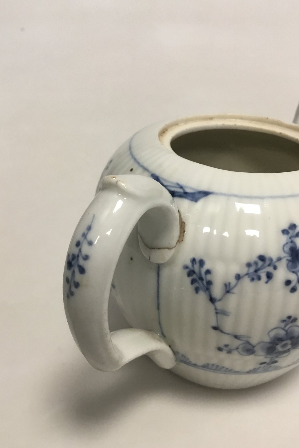 Royal Copenhagen Antique Blue Fluted Plain Small Tea Pitcher No 247. Repair on handle. Measures 10 cm / 3 15/16 in. high x 16 cm / 6 19/64 in.