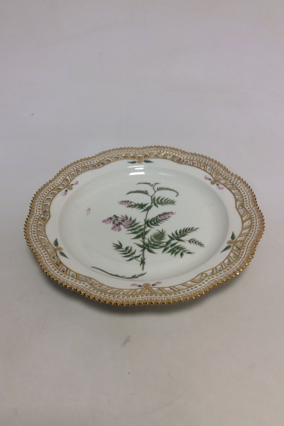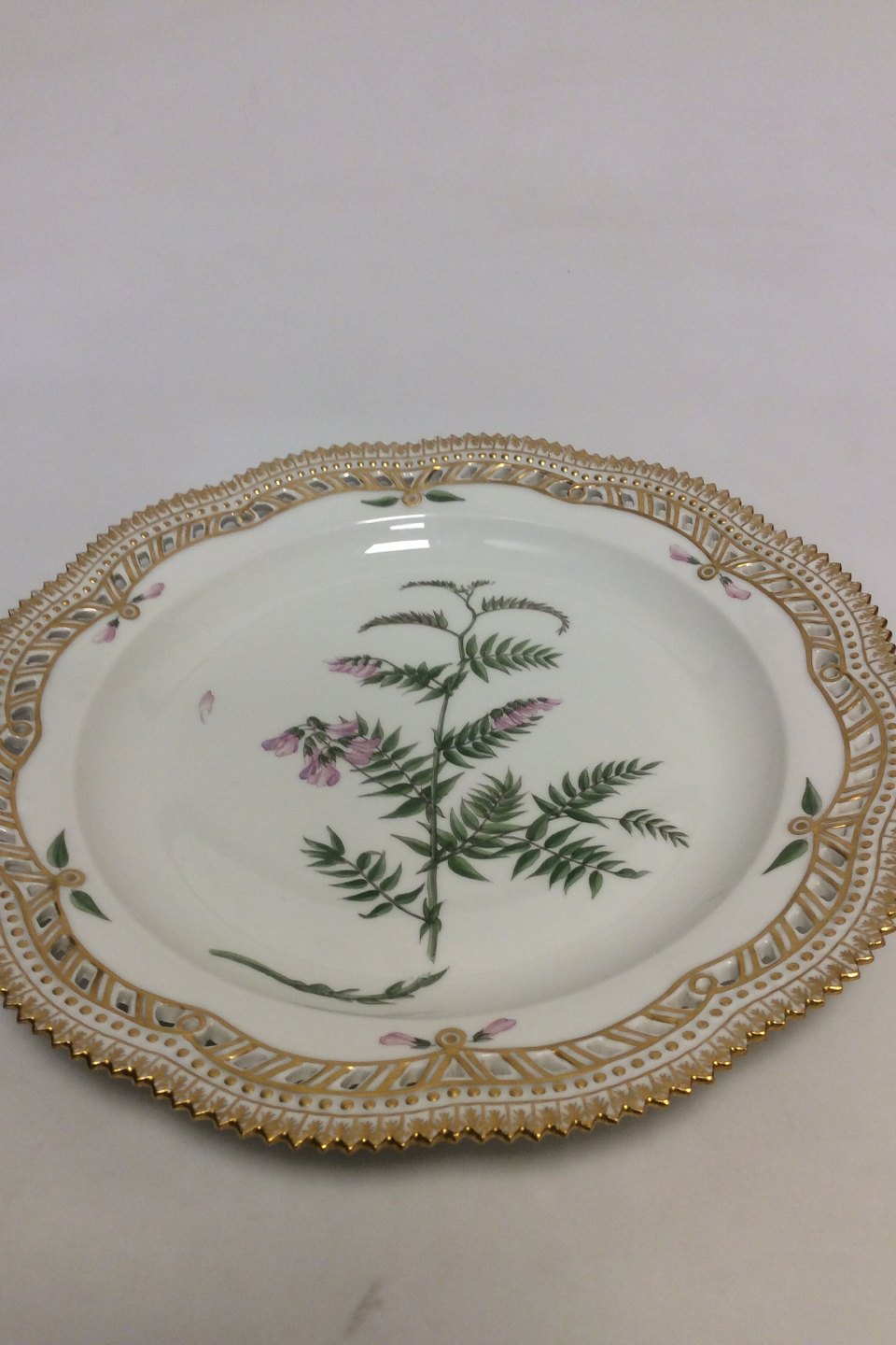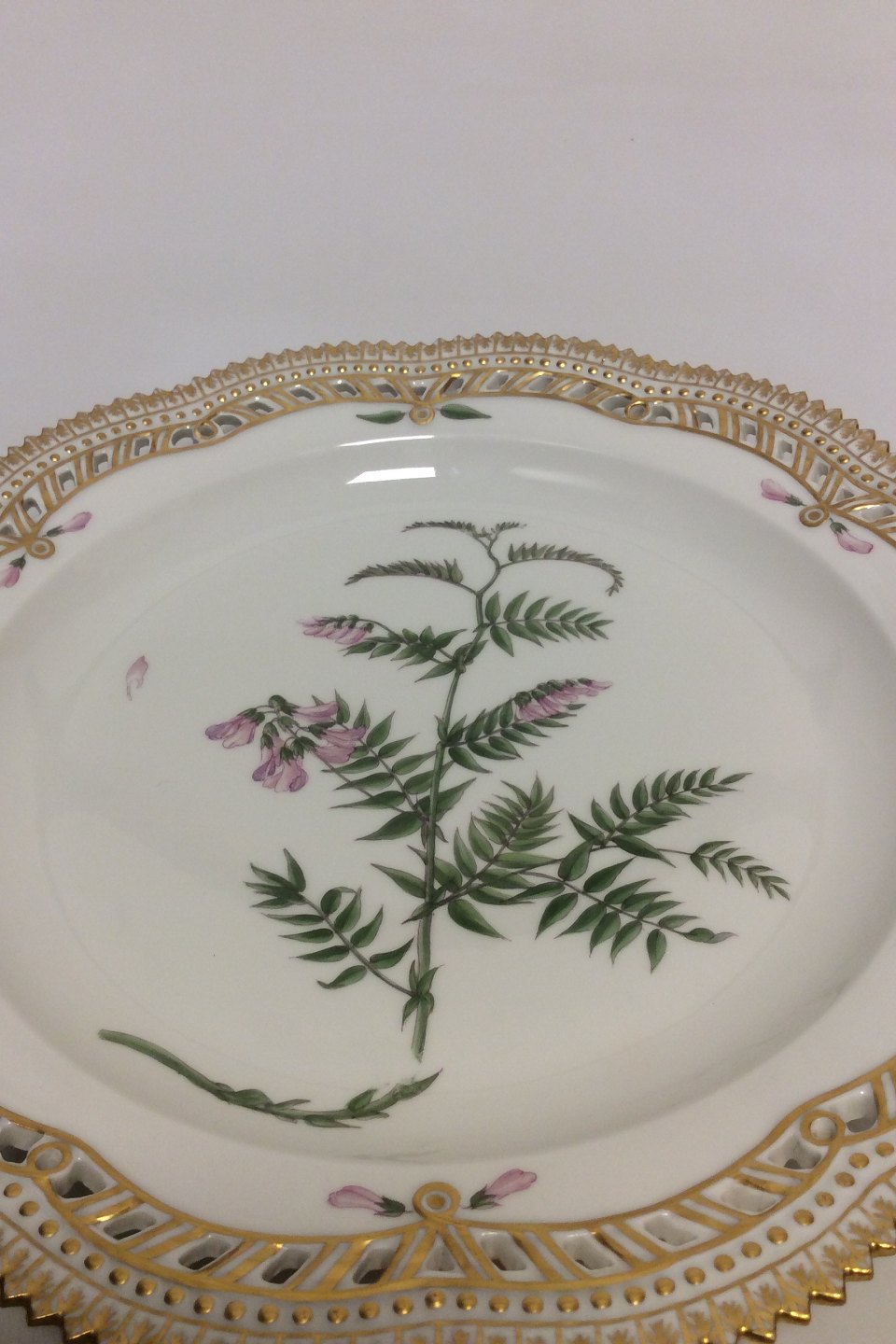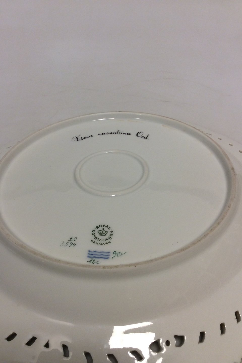Royal Copenhagen Flora Danica Charger plate with pierced border No 20/3574 or 381. Measures 28 cm / 11 1/32 in. Latin name: "Vicia cassubica Oed"