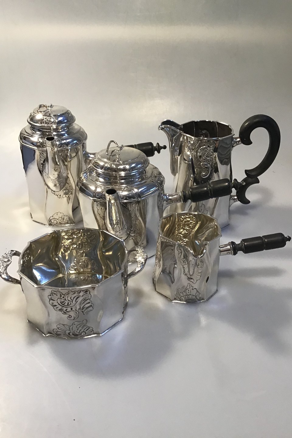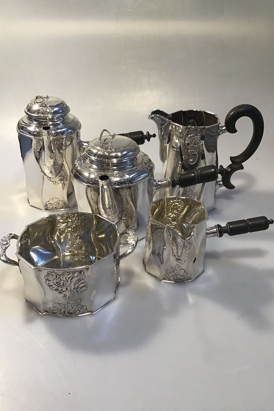 F. Hingelberg, L. Berth & others Danish Silver Coffee/Tea Set (5) Coffee Pot H. 15,5 cm, Tea Pot H. 13 cm, Creamer H. 15,5 cm, Sugar Bowl H. 6,5 cm, diam. 11,5 cm and Milk Jug H. 16 cm. Combined weight approx. 1700 gr.