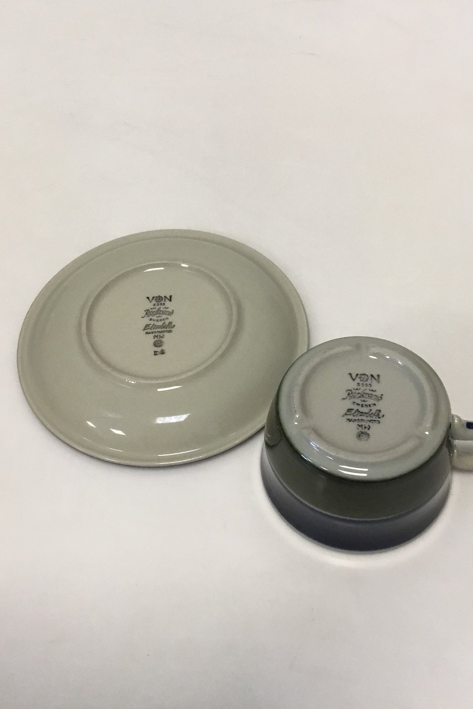 Rorstrand Elisabeth Coffee Cup and Saucer. Measures Cup: 5.5 cm / 2 11/64 in. x 8.5 cm / 3 11/32 in. dia. Saucer: 5 45/64 in.