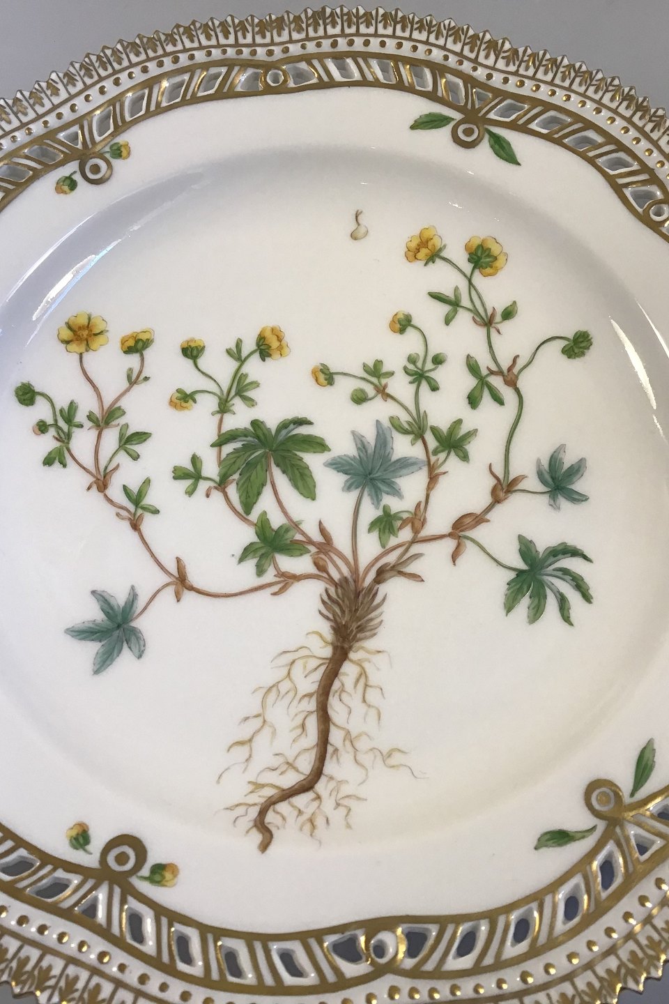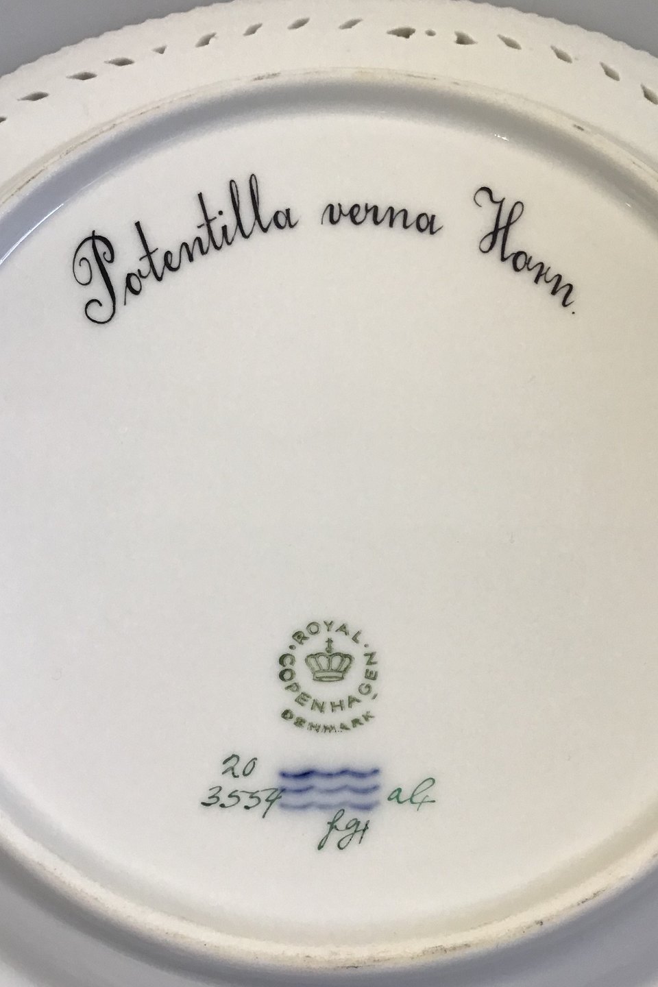 Royal Copenhagen Flora Danica Frokosttallerken No 20/3554 med gennembrudt kant. Latinsk Navn: Potentilla verna L (Vårpotentil). Måler 23 cm. 1. Sort.