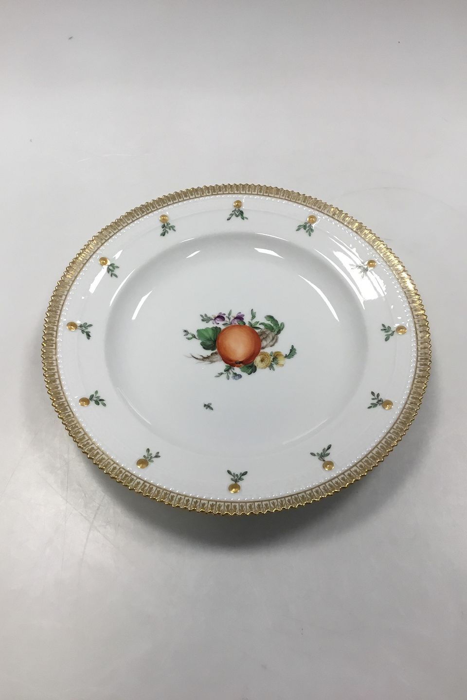 Middagstallerken No 17/3549. Dekoreret med frugter i overglasur og guldkant. Måler 25cm (9 27/32 in.)