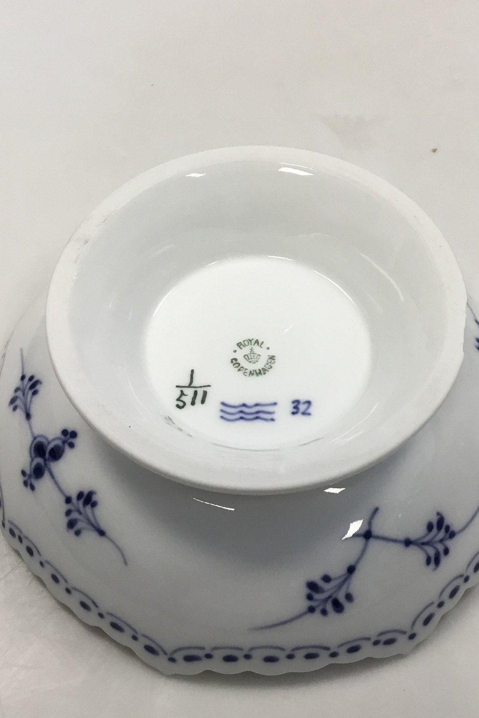 Royal Copenhagen Blue Fluted Half Lace Bowl on foot no 511. Measures 17.5 cm / 6 57/64 in. Has af chip on the foot and on the edge