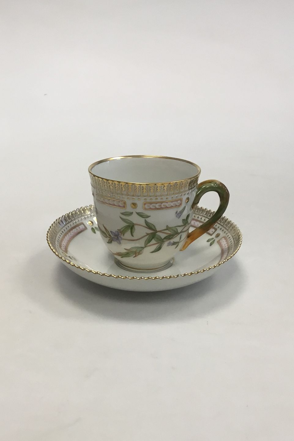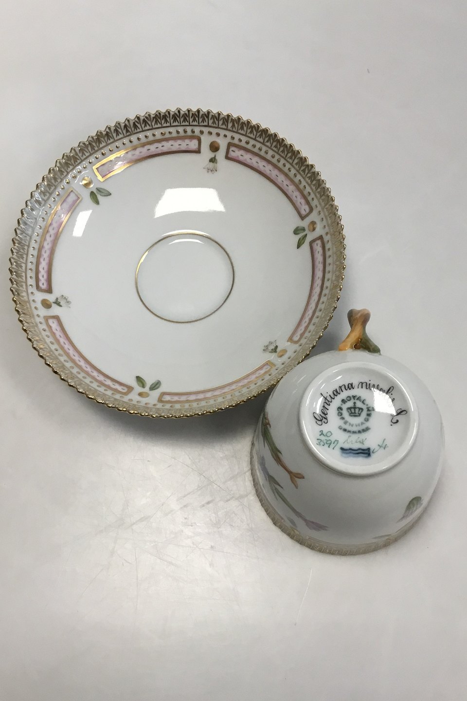 Royal Copenhagen Flora Danica Kaffekop og Underkop No 20/3597. Latinsk Navn: Gentiana nivalis L. Måler Kop: 7 cm x 7,5 cm dia. Underkop: 13,8 cm