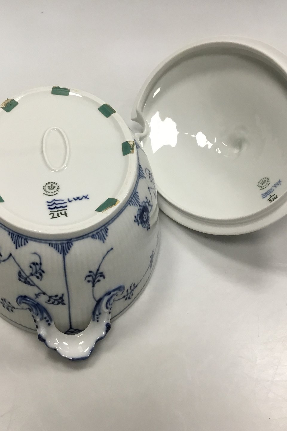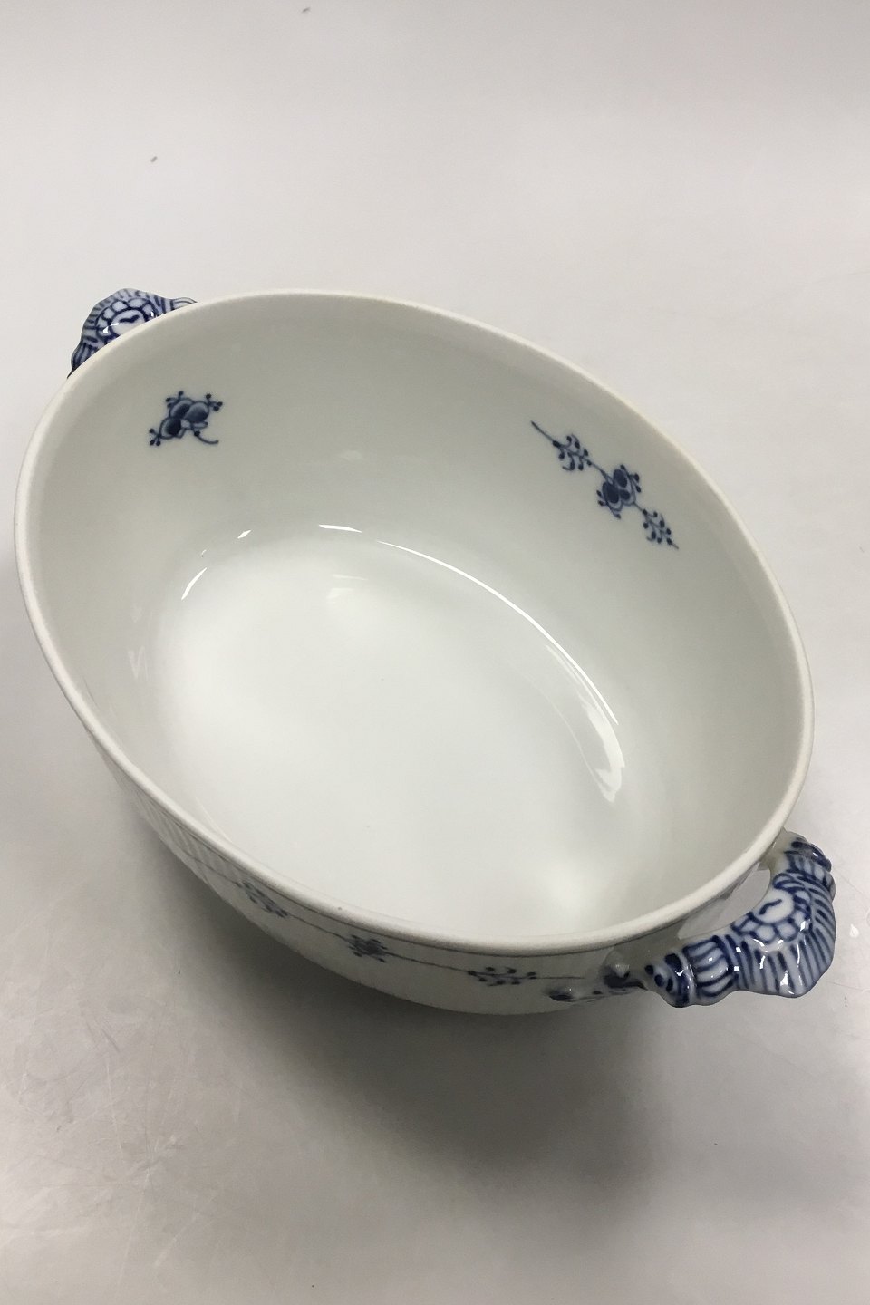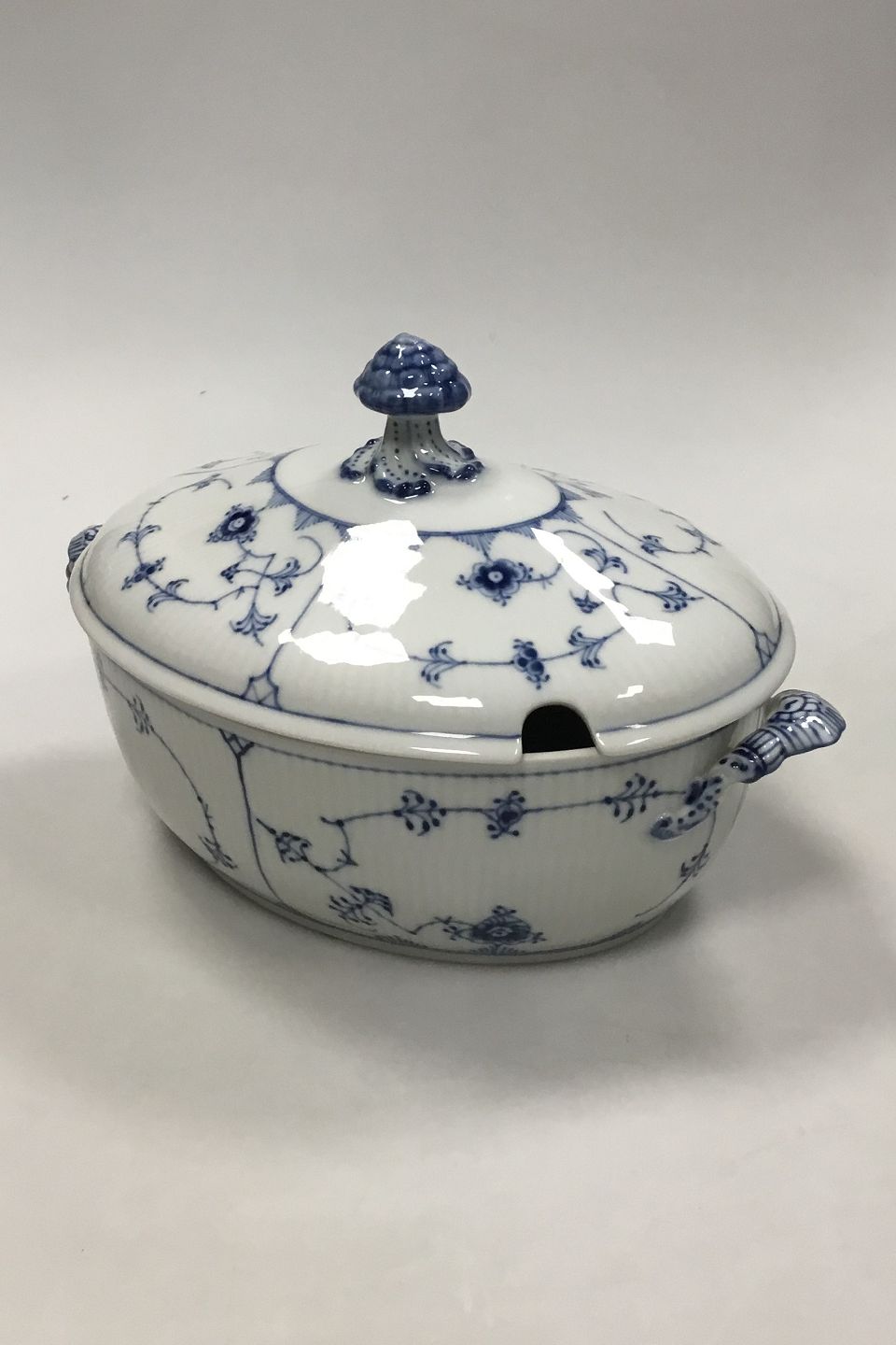 Royal Copenhagen Musselmalet Riflet oval terrin No 214. 1. sortering. Måler 27 cm x 20 cm ( 10 5/8 in. x 7 7/8 in. )