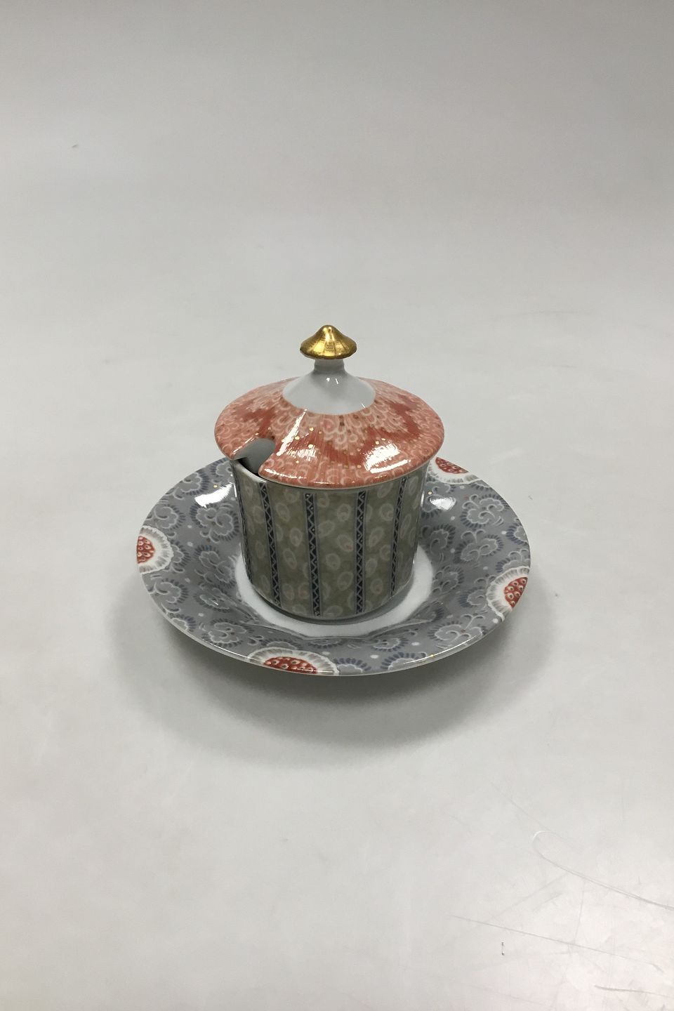 Royal Copenhagen Fairytale Mustard Jar No 200 with Lid No 199, and Saucer No 198 in Gray / Terracotta. Jar with lid measures 6.8 x 9 cm (2 43/64 x 3 35/64 in). Saucer mesures 12.5 cm (4 59/64 in).